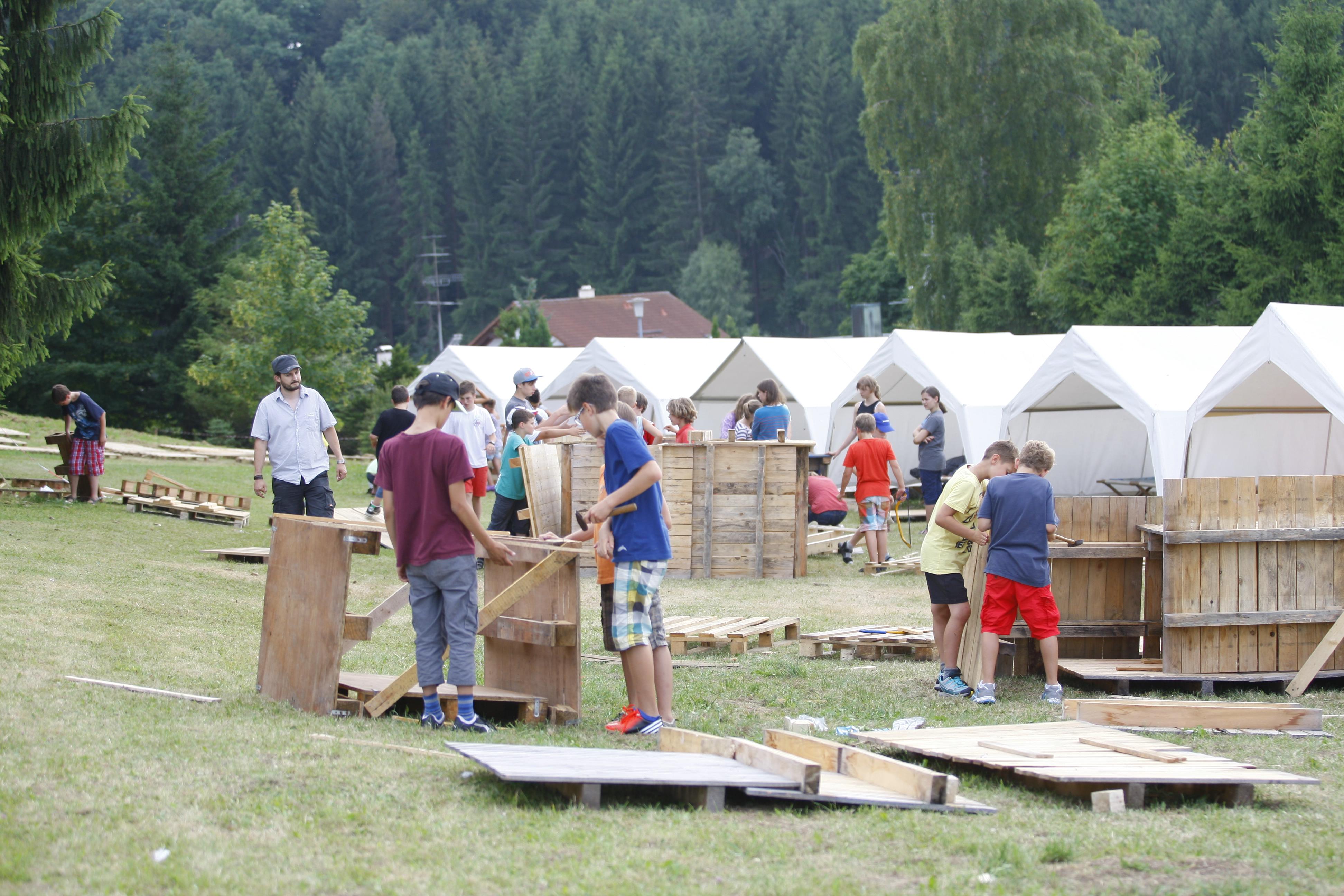 Nachdem alle Kinder sich eingerichtet hatten, startete auch schon der Kinder-Kennenlern-Tag. Geschafft von der großen Hitze ging es schon zum wohlverdienten Abendessen. Danach wurde im Sonnenuntergang fleissig an Palettenburgen gewerkelt.