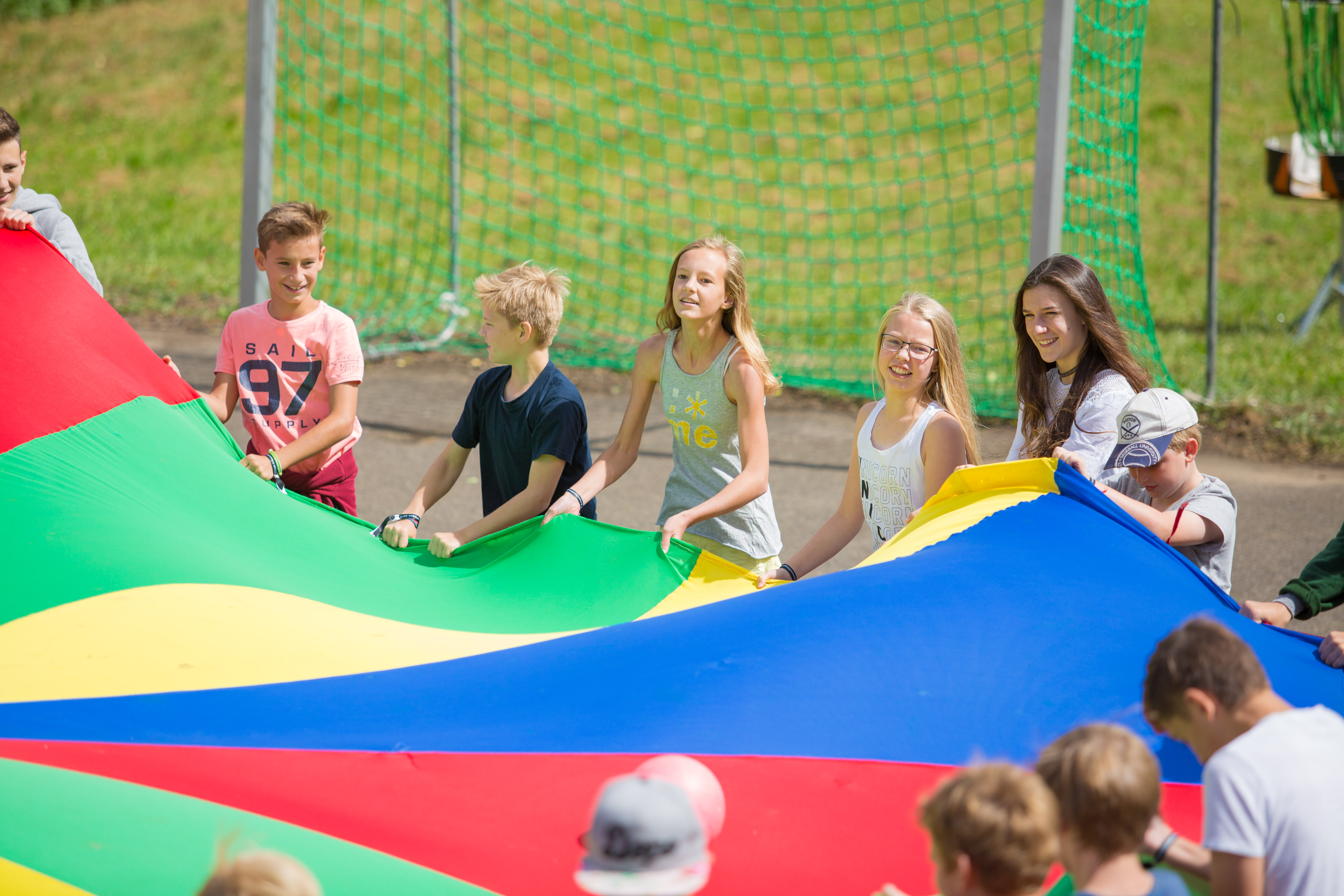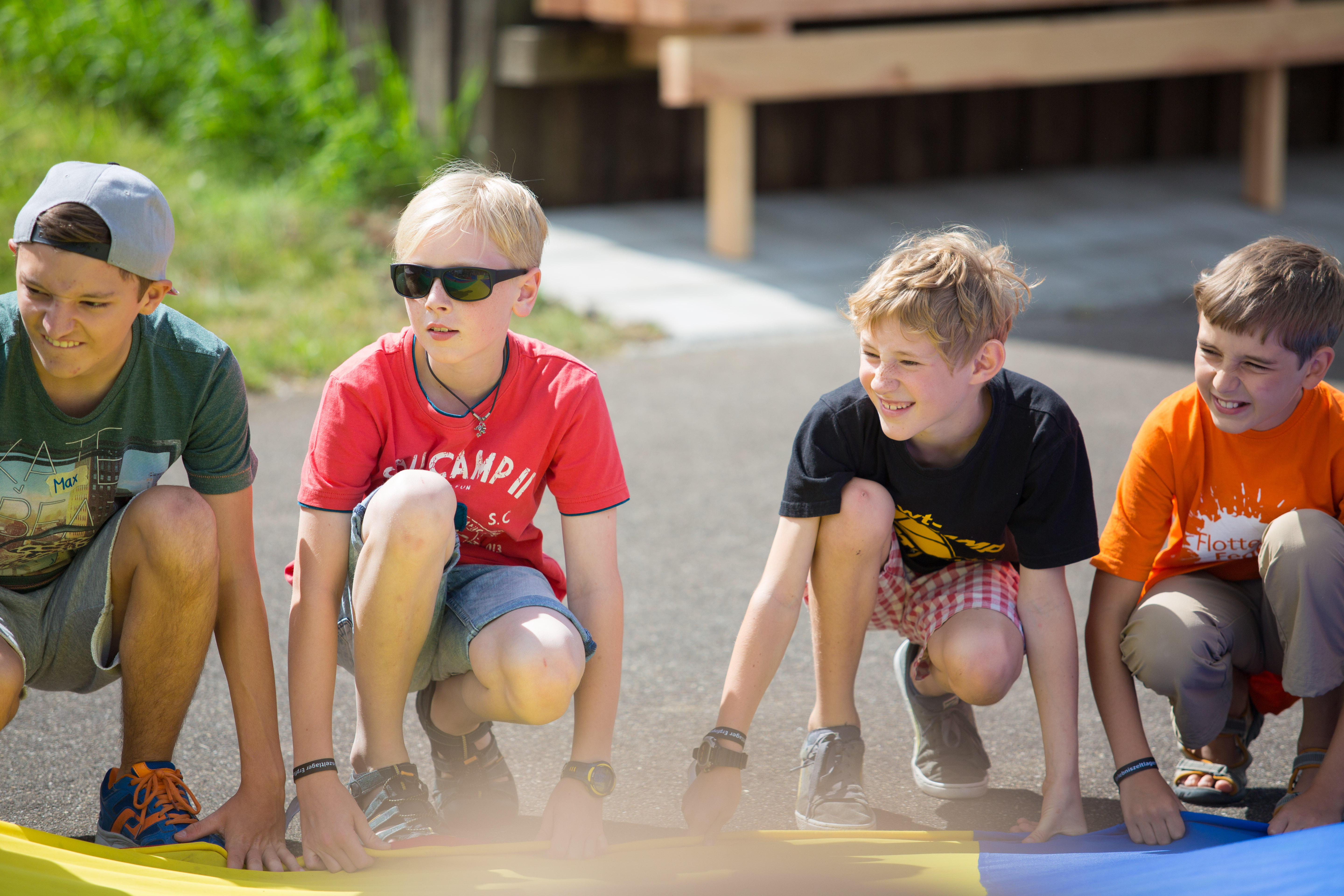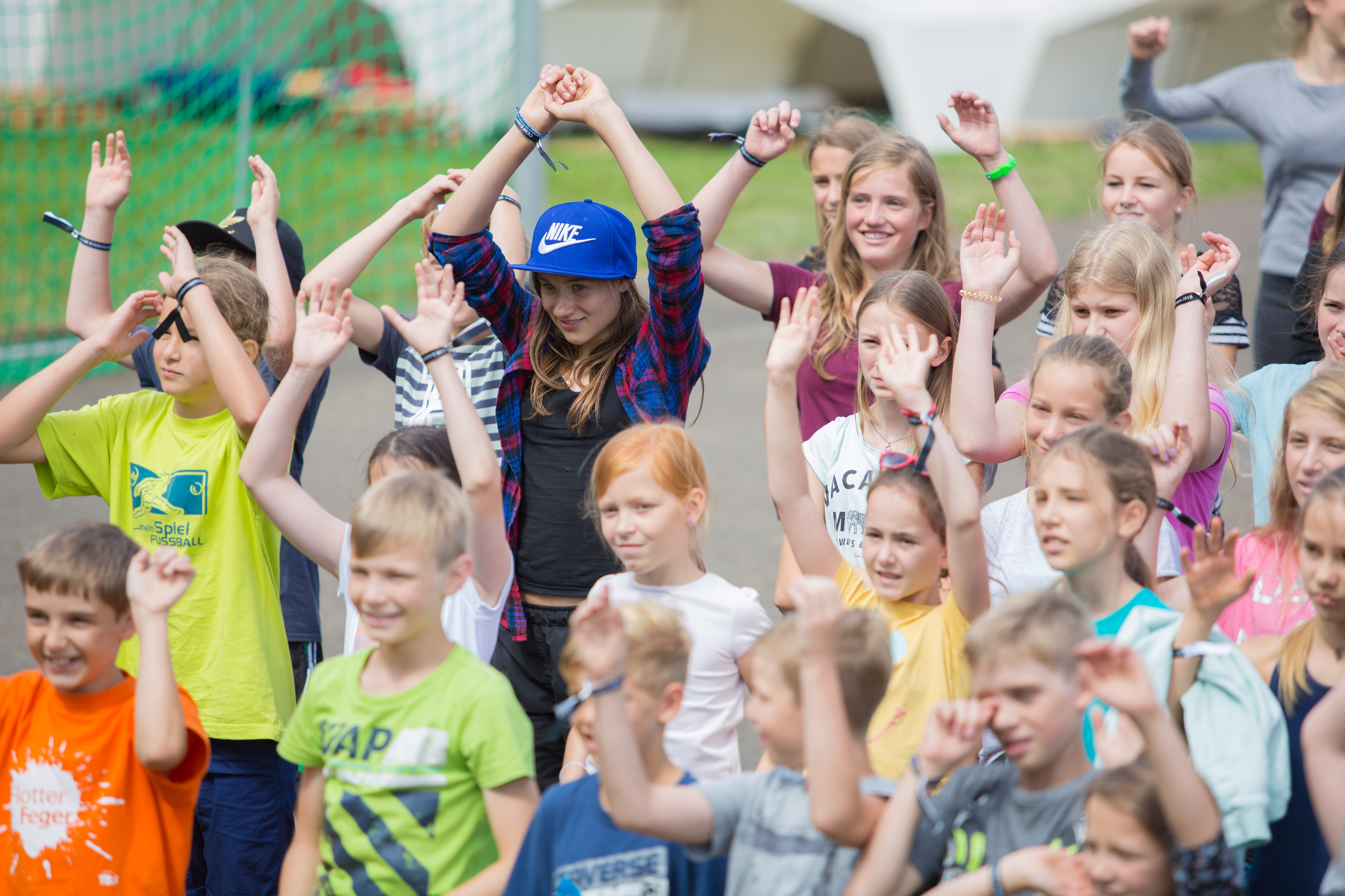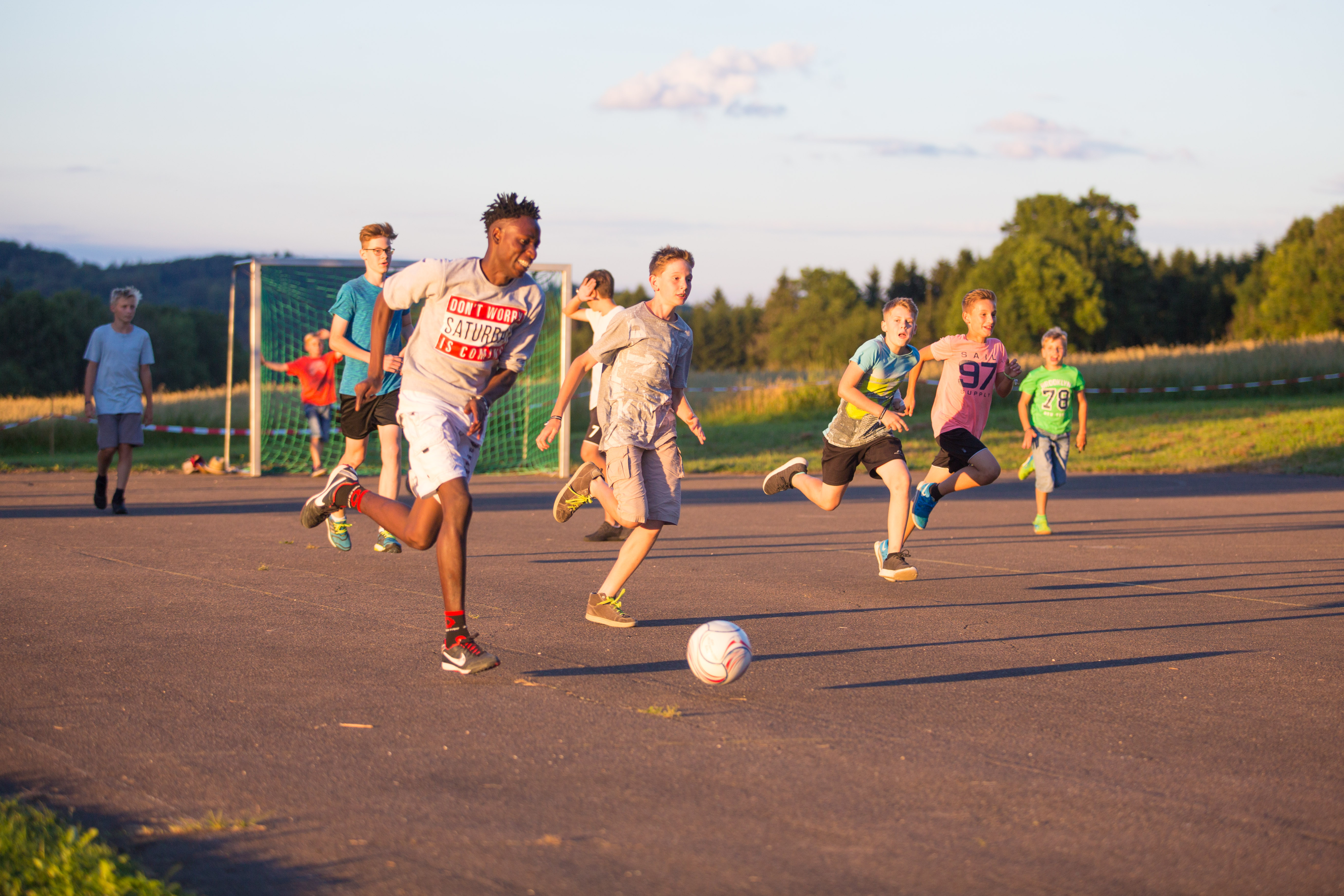 Viele Mitarbeiter-Kinder-Tandems schleifen kindsgroße Gepäckstücke auf die vorbereiteten Paletten und genehmigen sich dann einen Welcome-Drink an der Feuerstelle. Die ersten freudigen Kinderlachen schallen lautstark über den Platz. Nach dem letzten Schluck Saft geht es auf den Fußballplatz.
