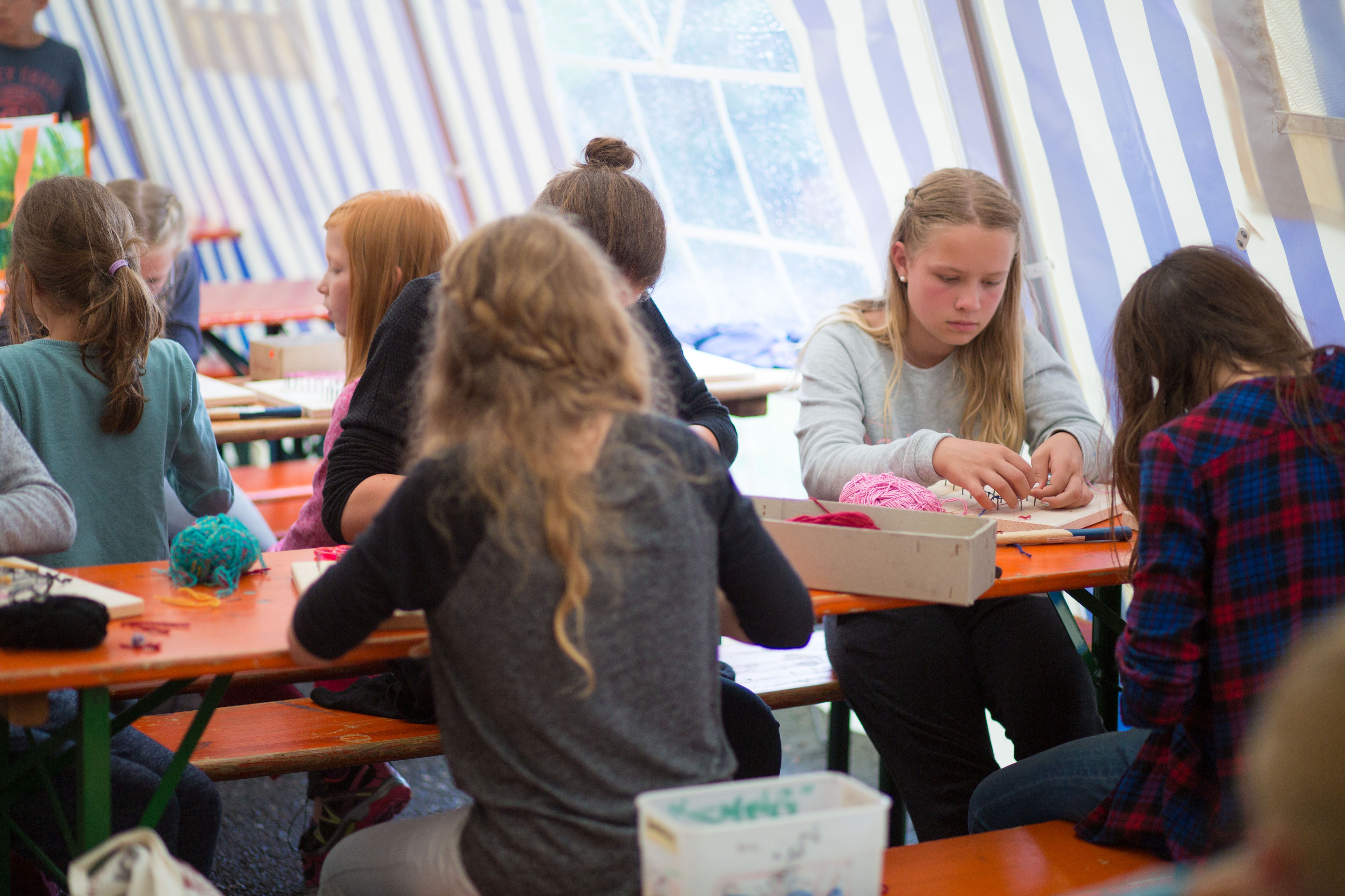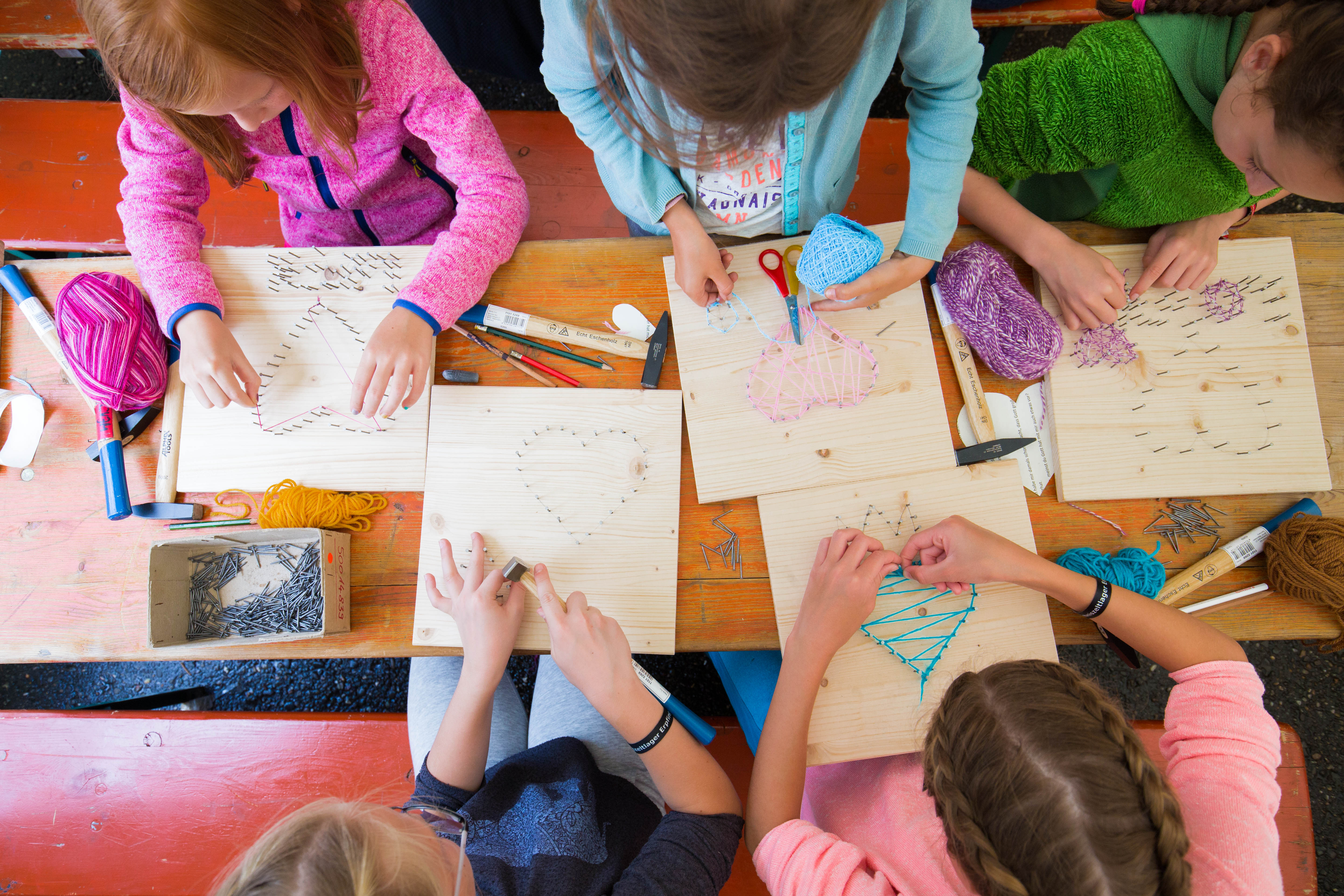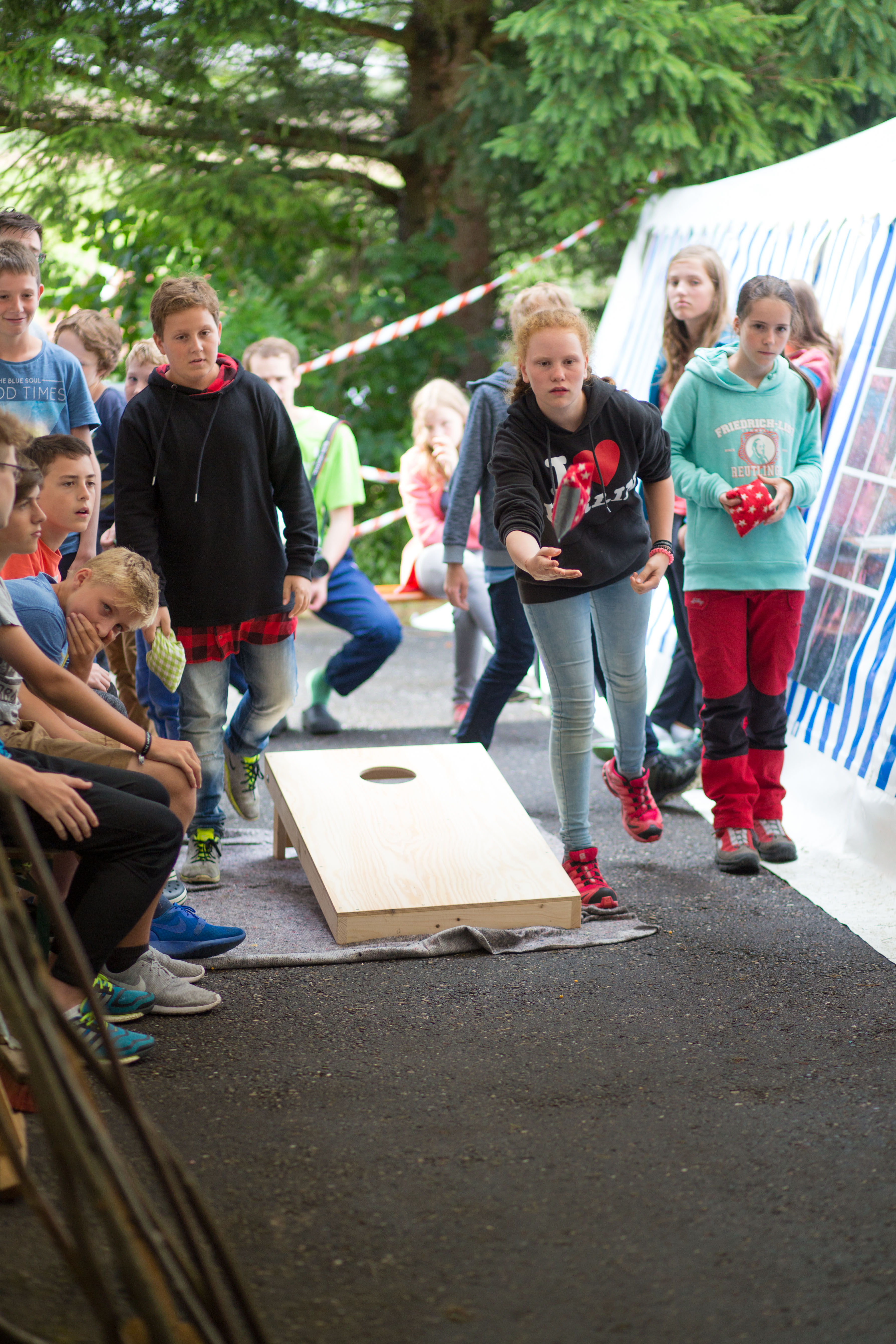 Das Regenwetter zwang uns, unser eigentliches Programm, das Geländespiel, zu verschieben. Zum Glück gibt es einige flexible Programmpunkte, die mit dem getauscht werden können. So fanden am Sonntag die kleinen Turniere statt, bei denen es eher um Geschicklichkeit als um Kraft geht. Wer keine Lust auf einen Wettkampf hatte, der konnte Taschen bemalen und bedrucken oder Nagelbilder hämmern.