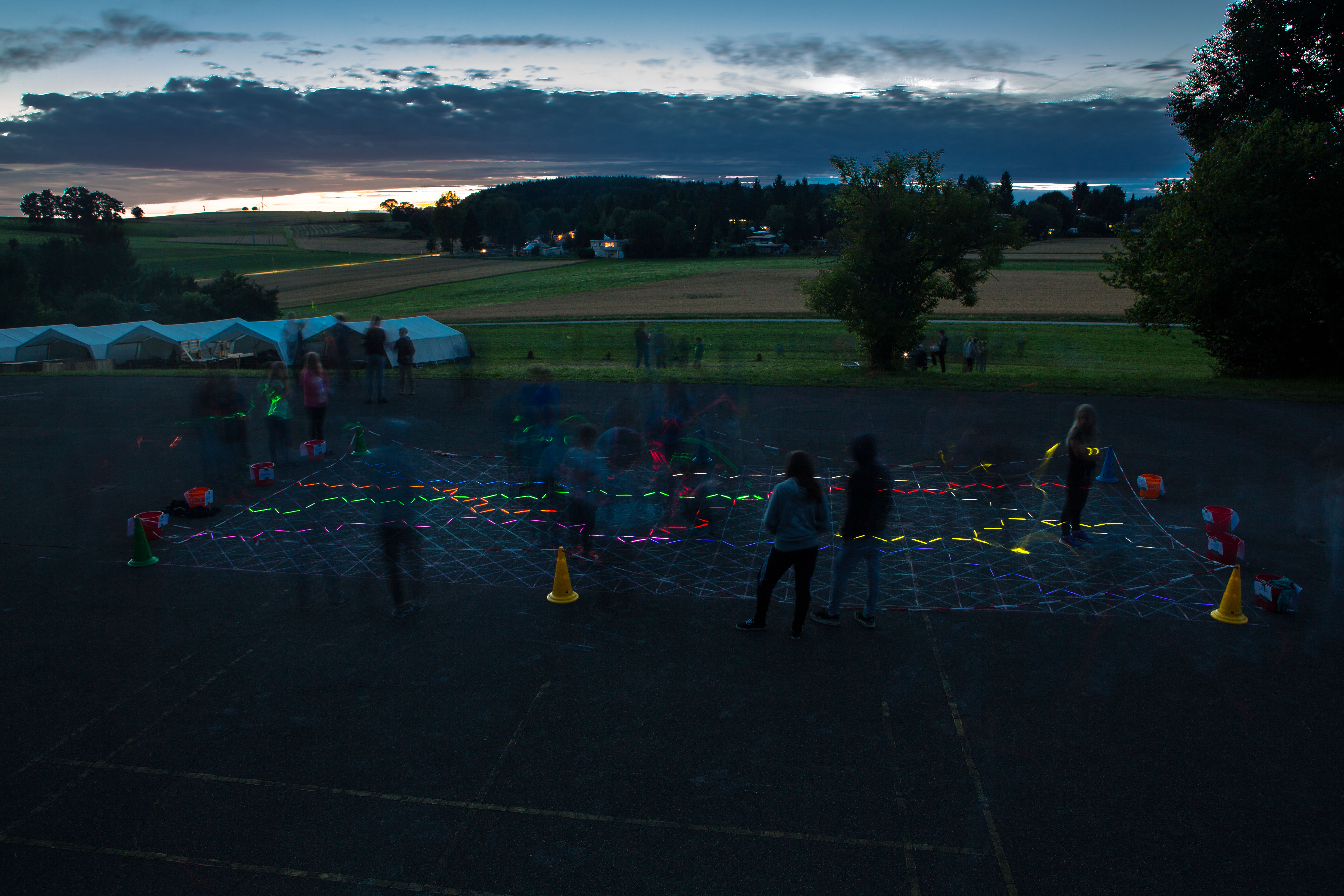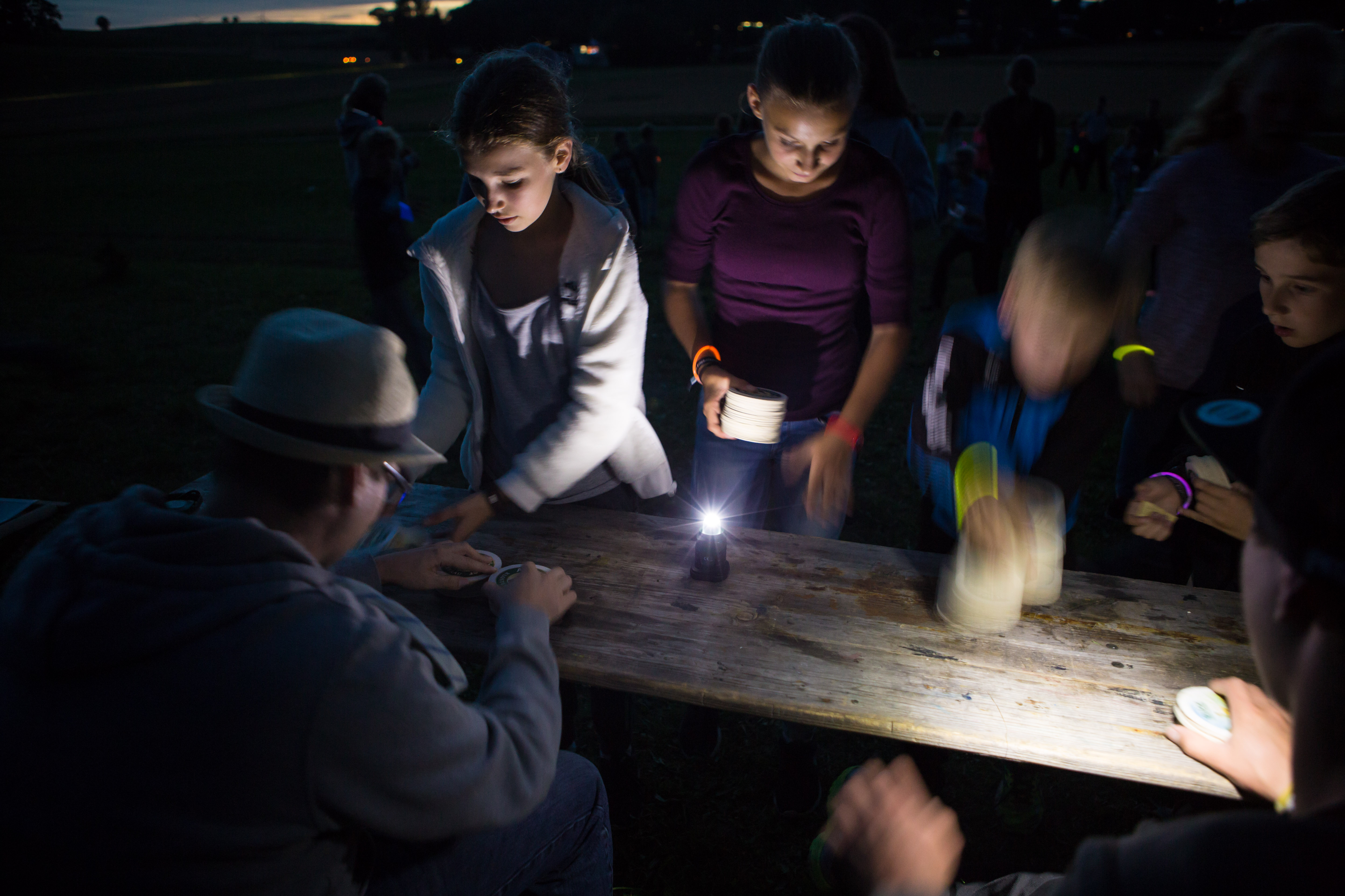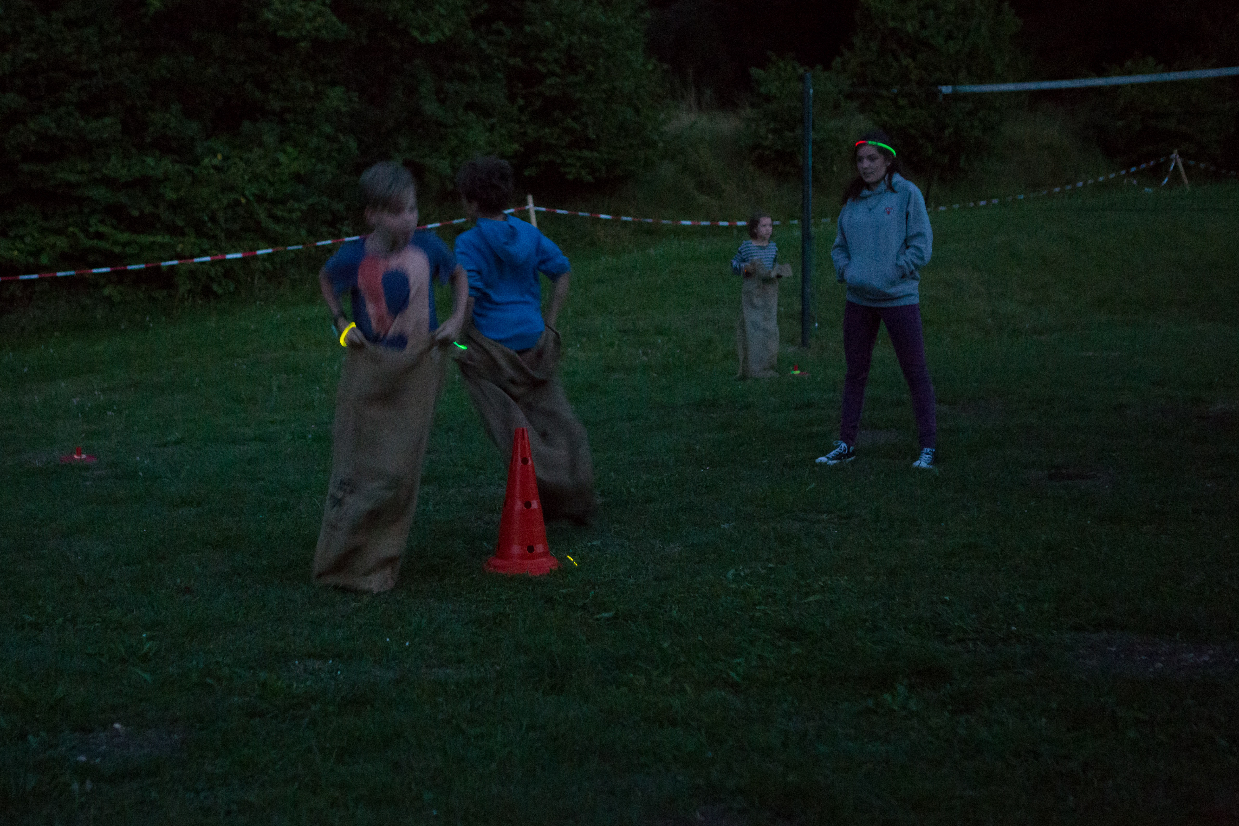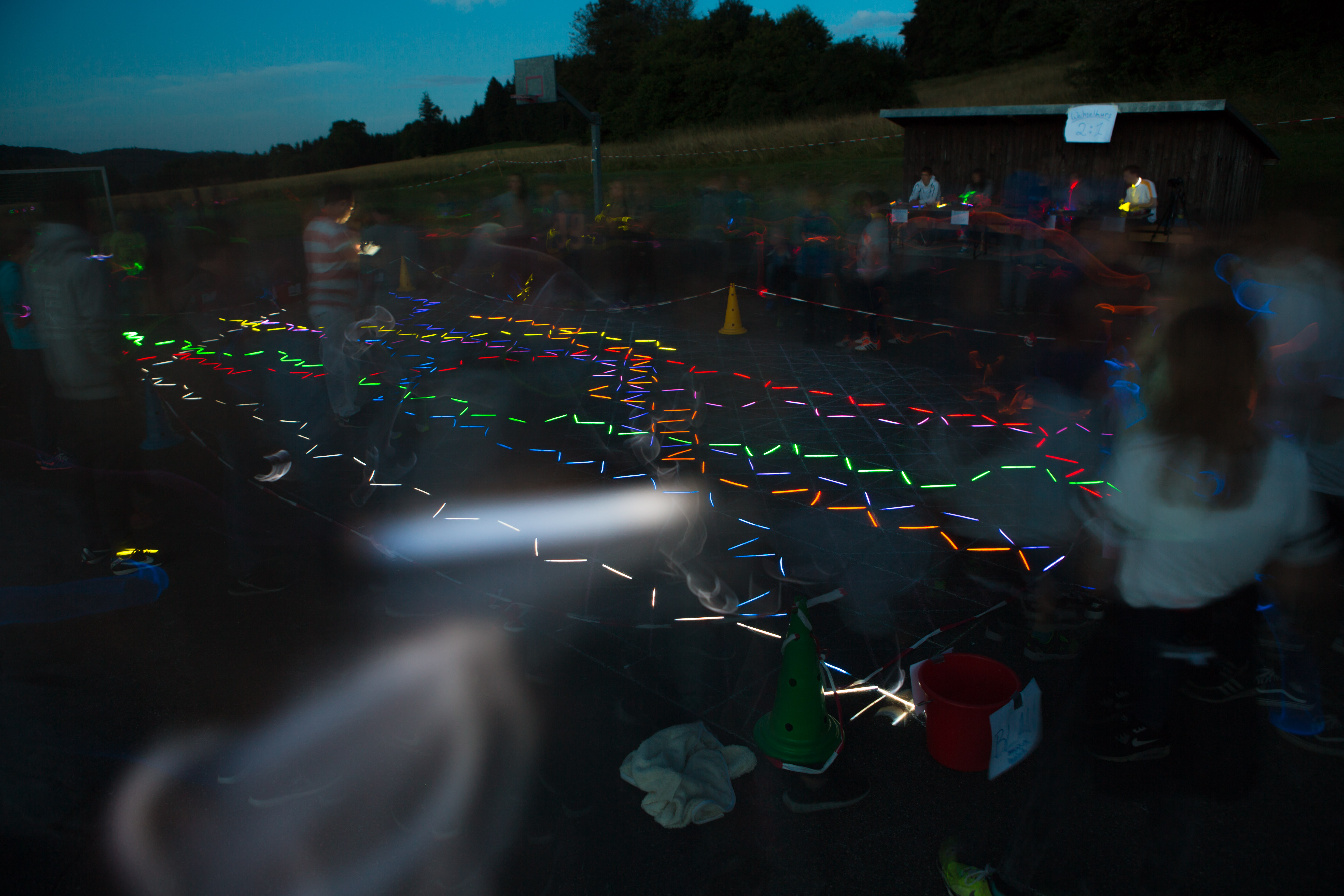Gestern Abend fand das Nachtgeländespiel statt, welches im schwindenden Abendrot ein buntes Mosaik aus Knicklichtern auf den Sportplatz zauberte. Ziel des Spiels war es als Erster auf die gegenüberliegende Seite des Spielfelds zu gelangen. Um die Knicklichter zu bekommen, mussten die Kinder in Minispielen Wertmarken verdienen, die sie dann an der Tauschstation gegen die leuchtenden Stäbchen eintauschen konnten.
