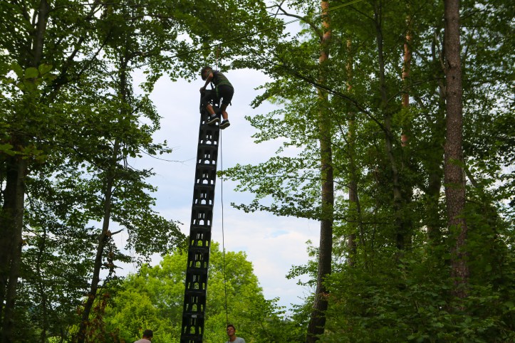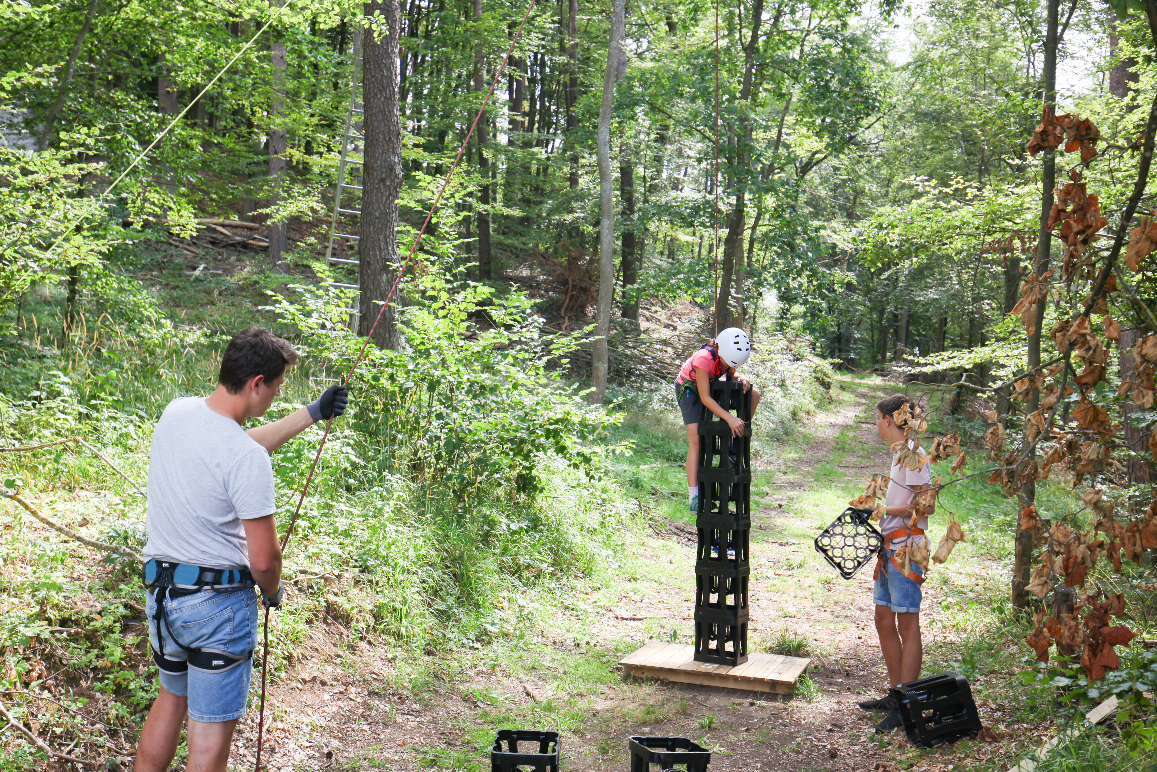 Richard und Leon sind verantwortlich für die Sicherheit (Helm, Klettergurt und Seil). Meistens kamen die Teilnehmer nicht die 5m des Seils hinauf, weil der Kistenstapel umgefallen ist.