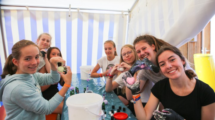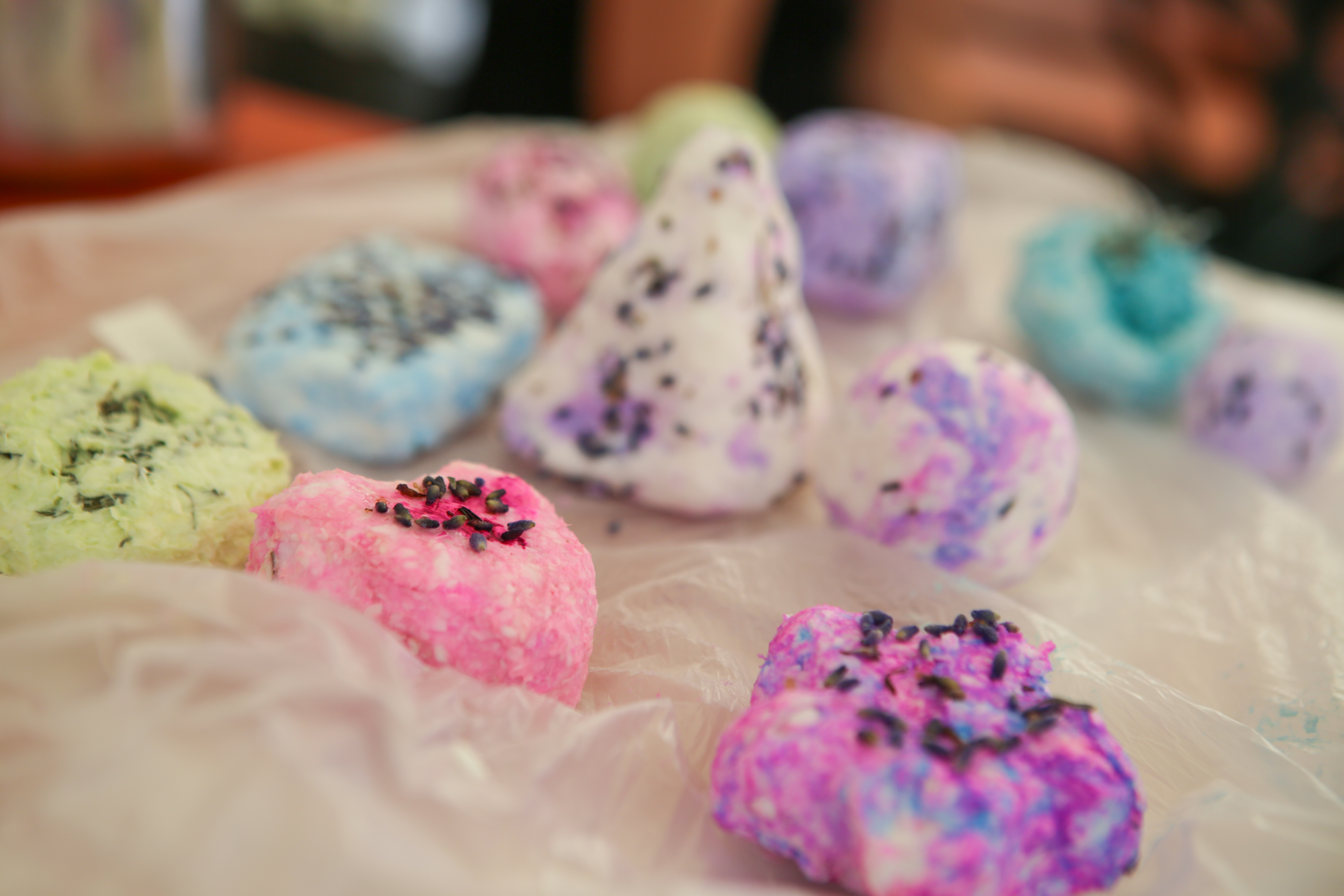 Kathi und Pauline leiten den Workshop Seifen machen. Mit Gerüchen von Lavendel, Zitrone, Orange etc. kneten sie ihre Seifen. Die Blockseifen eignen sich gut zum Verschenken oder selber Verwenden. Doch selbst sagen sie, dass sie lieber Flüssigseife nutzen.