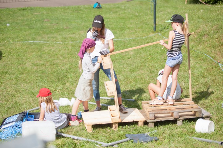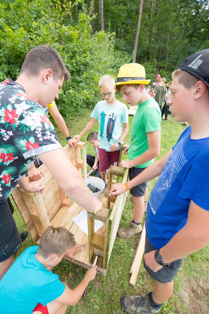 Gemeinsam „schafft“ man mehr. Genau deshalb wurde der Programmpunkt des „Cool Bauings“ verändert. In 13 bunt zusammengewürfelten Gruppen wurden 13 verschiedene kleine Stationen der zusammenhängenden Crazy Machine gebaut. Am einen Ende wurde Wasser in die Maschine gefüllt, welches eine lange Kettenreaktion auslöste an deren Ende die Lagerglocke geläutet wurde.