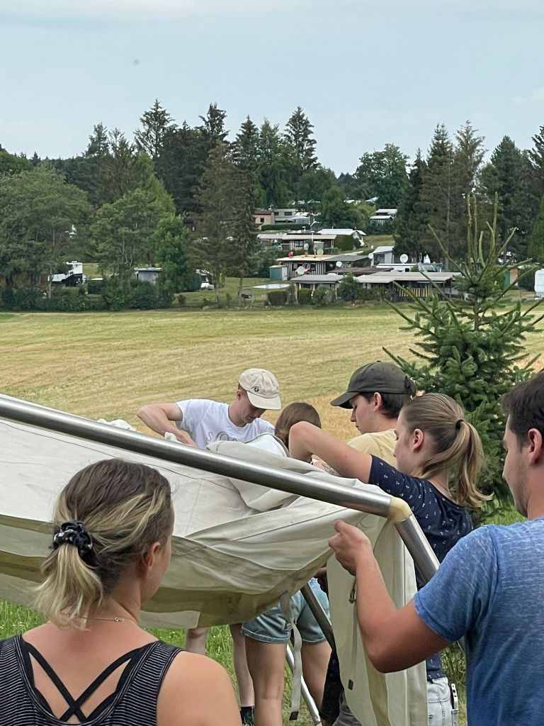 Ein wichtiger Bestandteil unseres Erlebniszeltlagers sind natürlich die Zelte. Am vergangenen Samstag trafen wir uns also um die Zelte endlich aus ihrem wohlverdienten Winterschlaf zu wecken. Die Zelte erfreuten sich am sonnigen & warmen Wetter, welches perfekt für den Aufbau geeignet war. Nun stehen sie, noch ein wenig verschlafen, bei uns in Erpfingen und freuen sich schon am Freitag 80 Kinder in Empfang nehmen zu dürfen um eine unvergessliche Zeit zu verbringen. Bis dahin sollten sie genug Zeit haben ihre Schläfrigkeit abzuschütteln und sich an die Umgebung zu gewöhnen. Wir werden den Zelten ab Mittwoch Gesellschaft leisten um Sie langsam an Menschen zu gewöhnen. Bis Freitag!