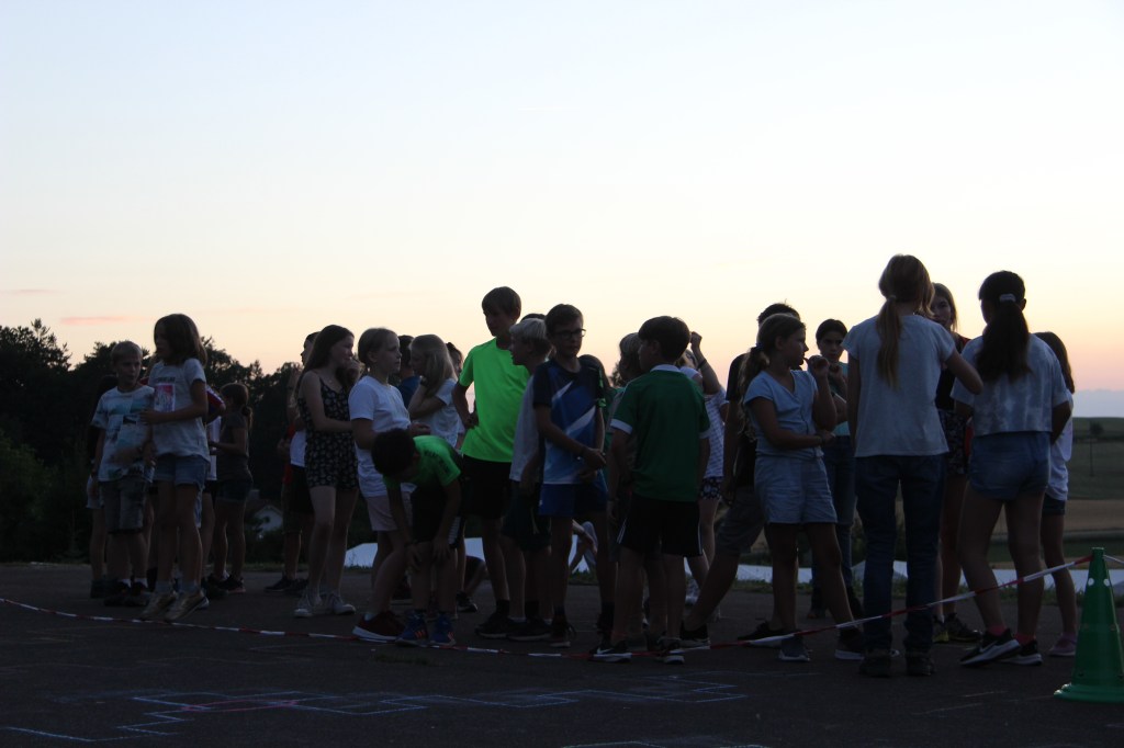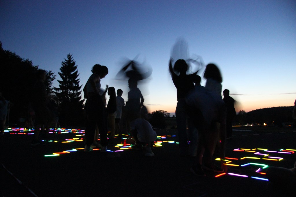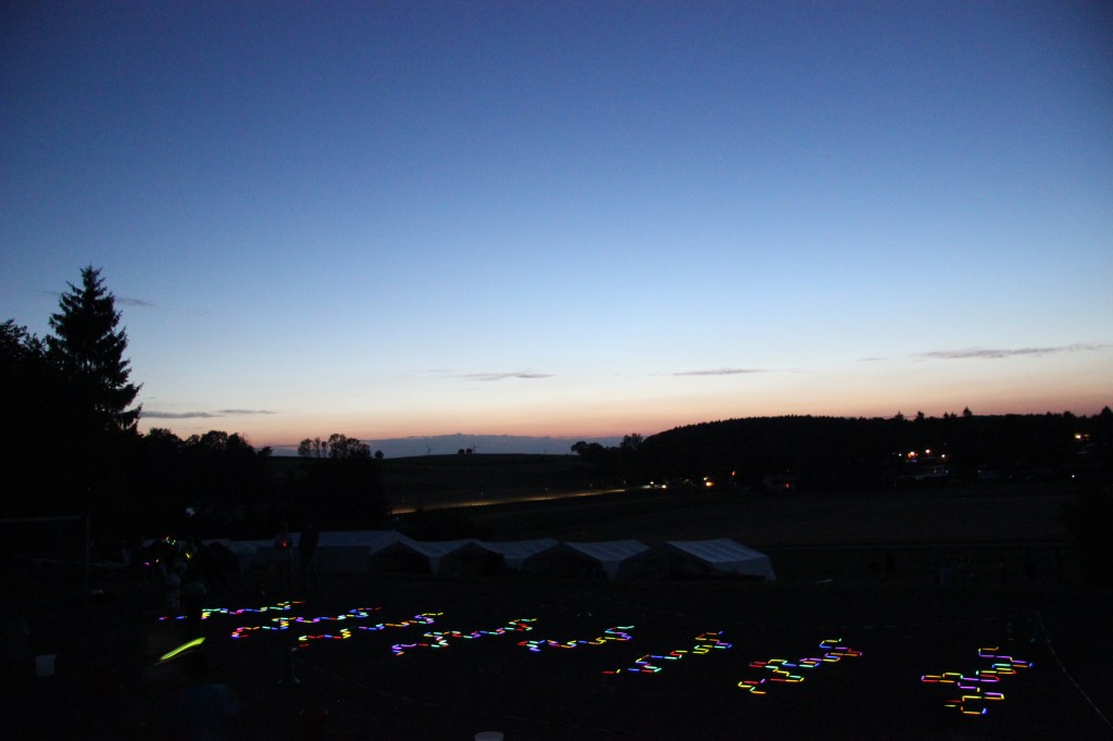 Nach einem entspannten Nachmittag und leckeren Hotdogs zum Abendessen stand das Nachgeländespiel auf der Tagesordnung. Dabei mussten die Kinder bei verschiedenen Minispiele Märkchen verdienen, die in leuchtende Wegteile für ein Labyrinth umgetauscht werden konnten. Mit der hereinbrechenden Dunkelheit erleuchteten die Knicklichter das Gelände und die Herzen der Kinder.