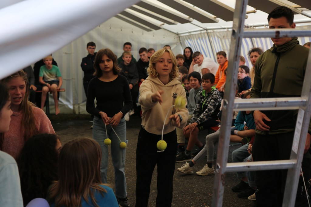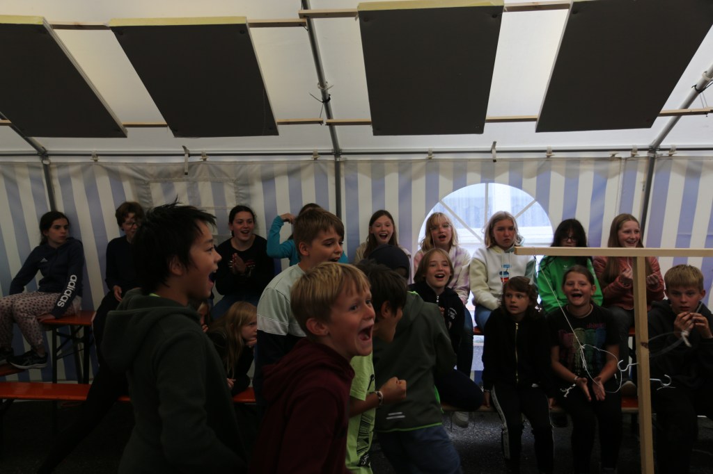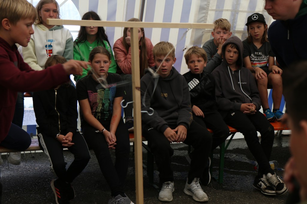 Nutella begrüßte die Kinder heute Morgen anlässlich des letzten vollen Zeltlagertages beim Frühstück. Nachdem, wie jeden Tag, auch der Spüldienst fertig war, konnten sich die Kinder zum wiederholten Male an den Improvisationstheaterkünsten der Mitarbeiter*innen erfreuen. Diesmal mit einer abgewandelten Variante des Gleichnisses vom verlorenen Schaf: