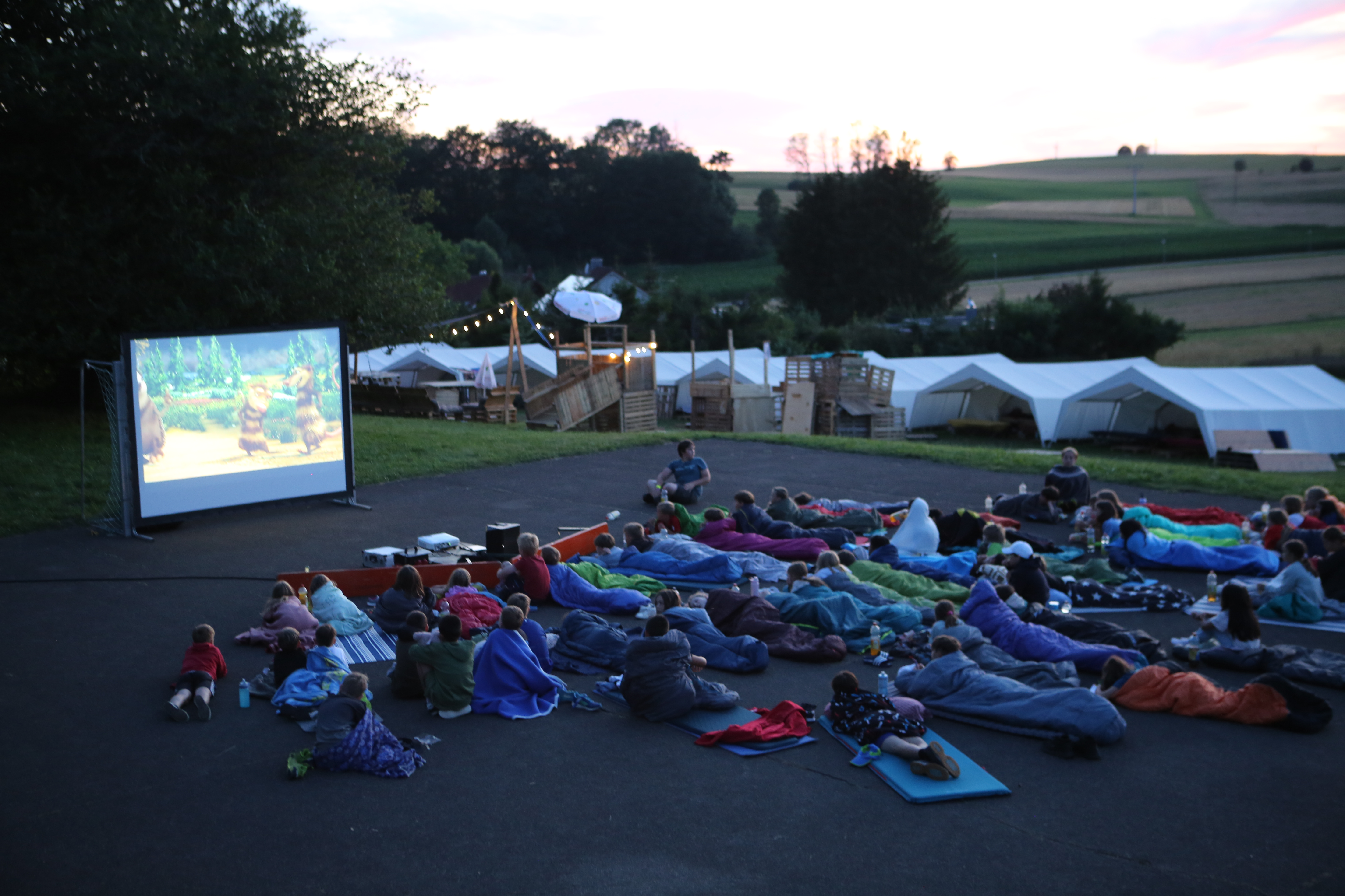 Zum Abendessen gab es Maultaschen mit Kartoffelsalat und danach haben wir den Film Ice Age 4 im Open-Air-Kino geschaut.