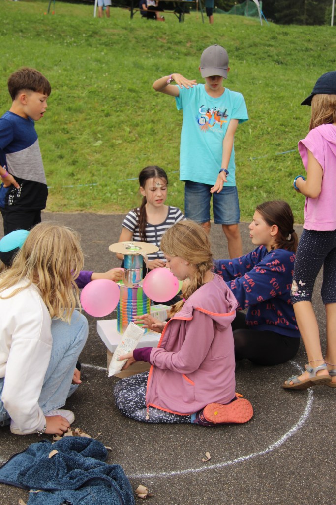 Nach dem Frühstück wurde das Nachtgeländespiel, welches gestern aufgrund des Wetters nicht stattfinden konnte, nachgeholt. Auf dem Sportplatz wurden dann die höchsten, schönsten und breitesten Türme aus Alltagsmaterialien gebaut. Diese Materialien konnte man sich mit erspielten Edelsteinen kaufen.