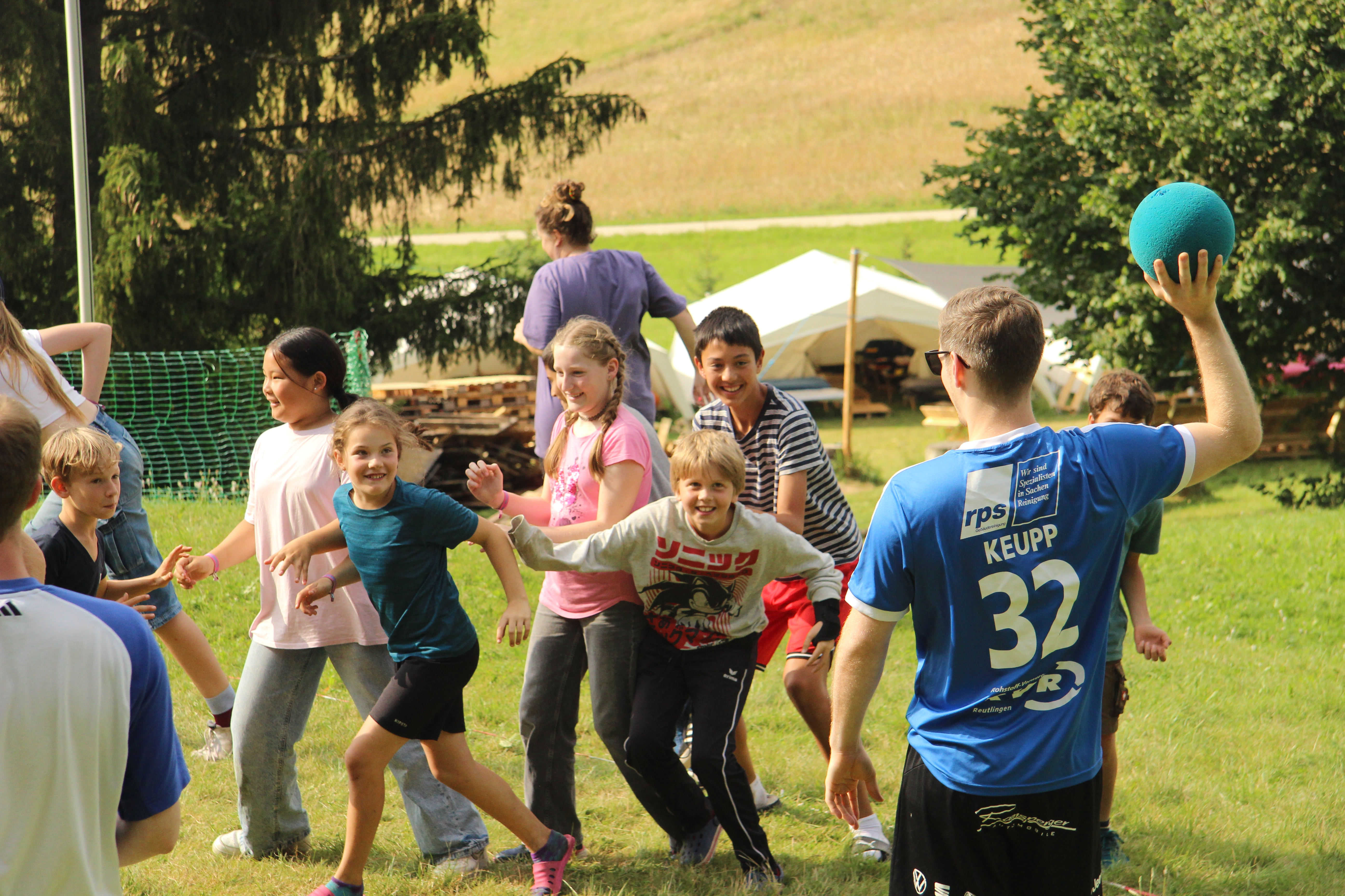 Nach dem Mittagessen wurde das Bibelerebnisprogramm nachgeholt. Anschließend traten die Kinder gegen die Mitarbeitenden beim Fuß- und Völkerballturnier an. Die Mitarbeitenden konnten nur durch schummeln gewinnen. Leider regnete und hagelte es danach sehr stark.