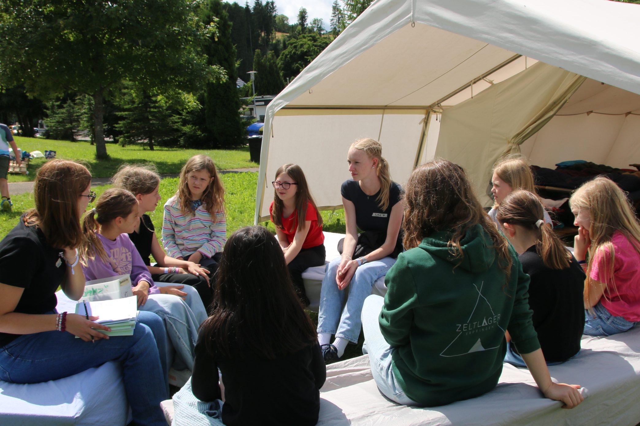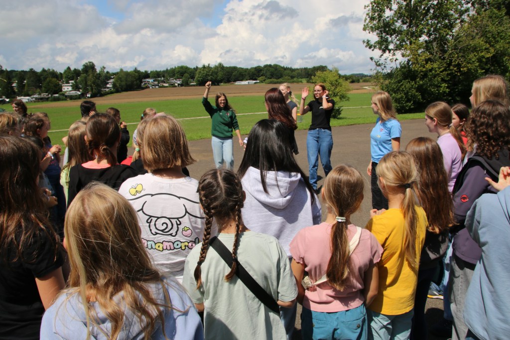 In Erpfingen angekommen, wurden die Kinder bei strahlendem Sonnenschein auf dem Sportplatz herzlich empfangen. Nach ein paar kurzen Spielen – darunter das beliebte Schnick-Schnack-Schnuck Evolution, bei dem man sich vom Kleinkind bis zur Rente durch das Leben spielt – ging es direkt an die Zelteinteilung.