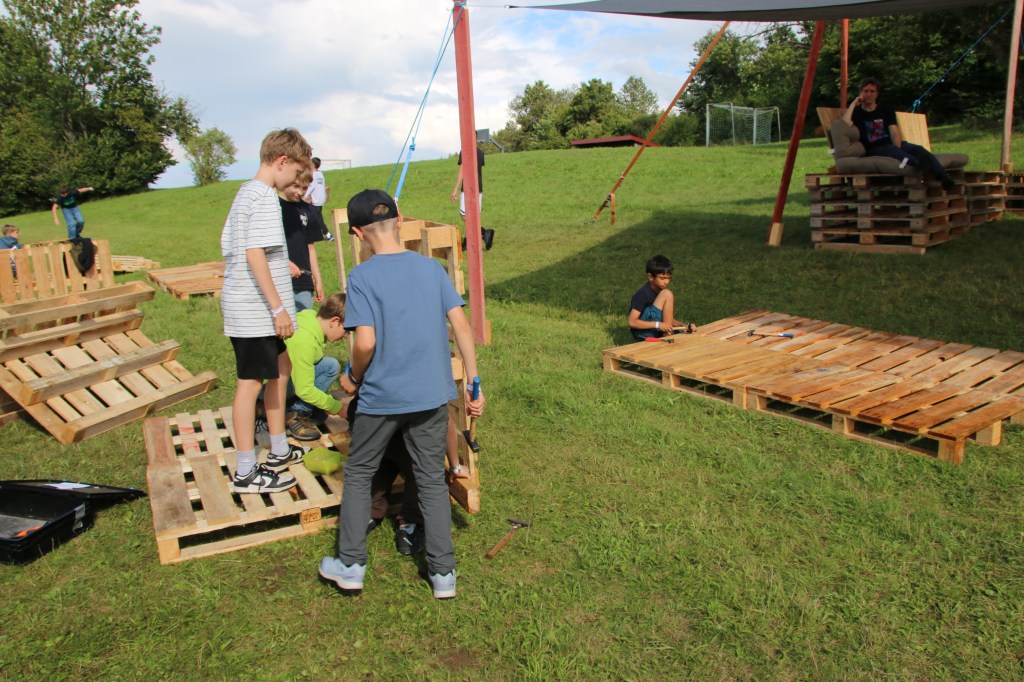 Schnell das Bett beziehen, Gepäck auf Paletten werfen und los geht’s! Der Platz wurde erkundet, neue Freundschaften geschlossen und alte wieder aufgelebt. Überall wuselt es: Palettenburgen werden gebaut, Völkerball gespielt, Scoubidou geknüpft – und das alles mit einem Lächeln im Gesicht. Wenn man das Treiben sieht, fragt man sich wirklich: War hier etwa ein ganzes Jahr Pause?