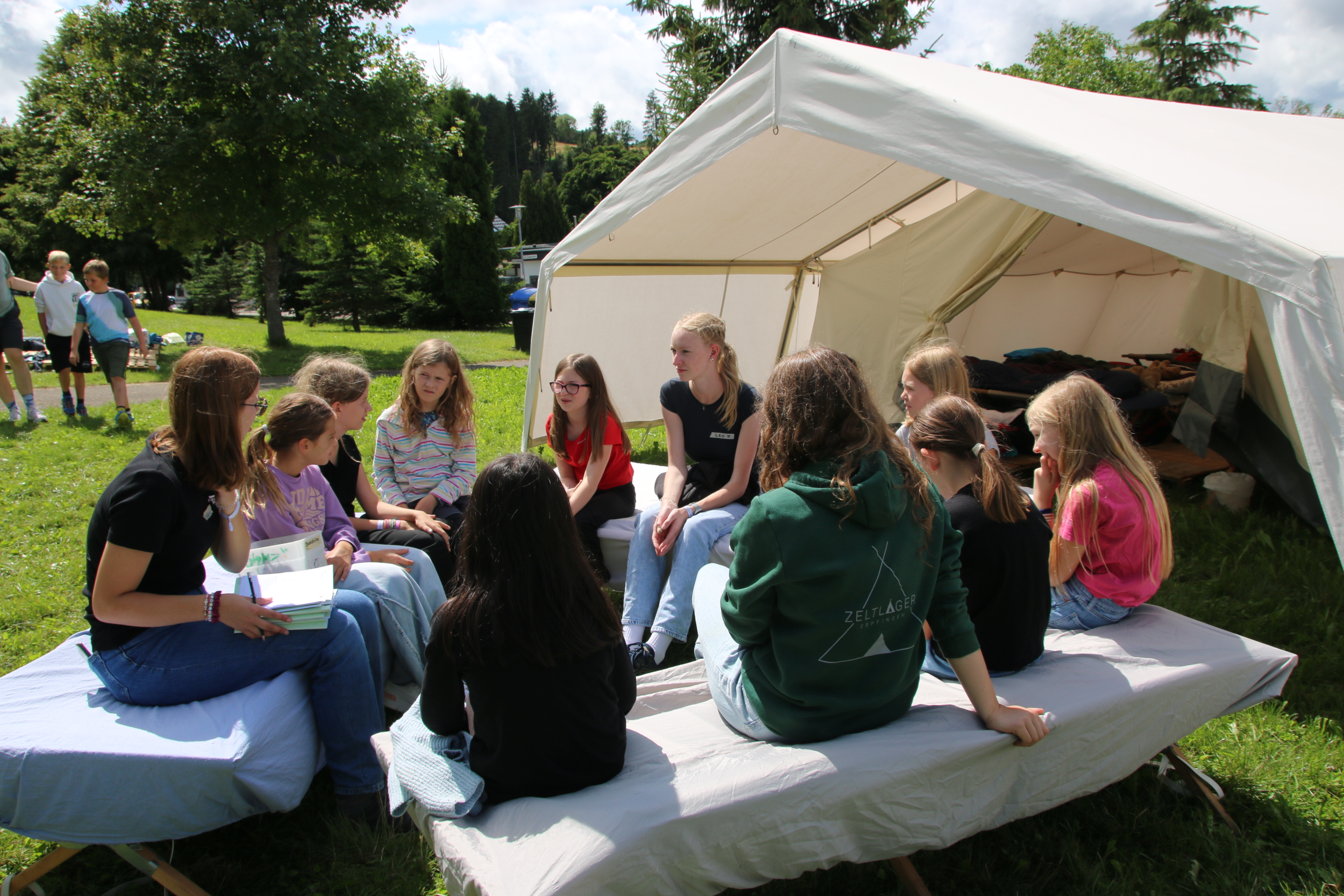 In Erpfingen angekommen, wurden die Kinder bei strahlendem Sonnenschein auf dem Sportplatz herzlich empfangen. Nach ein paar kurzen Spielen – darunter das beliebte Schnick-Schnack-Schnuck Evolution, bei dem man sich vom Kleinkind bis zur Rente durch das Leben spielt – ging es direkt an die Zelteinteilung.