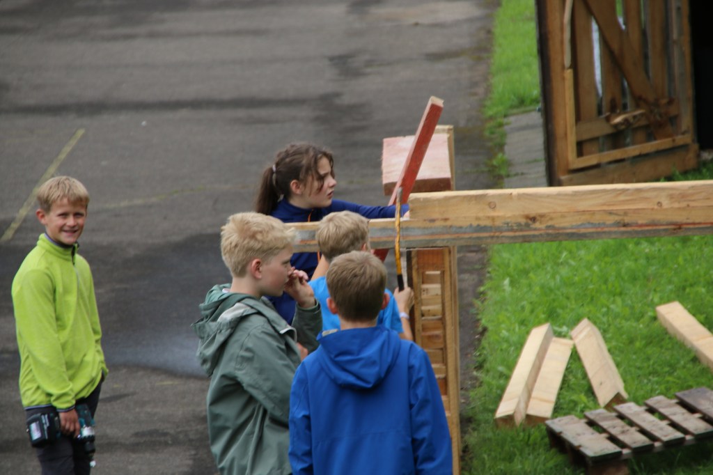 Auf das wir bei den Bienen ziemlich schnell fertig waren, liefen wir darauf zu denen mit dem Hammer. Gemeint ist die Gruppe, die selbst eine Tribüne baut.