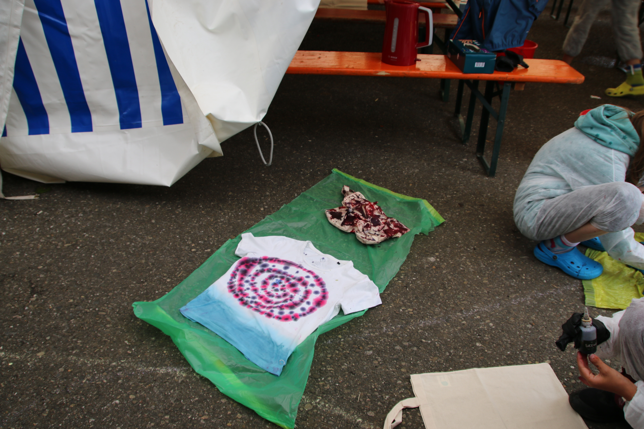 Auch das Essenszelt wurde mit einem Programmpunkt belegt. Zwischen der guten Stimmung, Batik-Farben und trockenen T-Shirts sowie Taschen, konnten wir uns gerade so jemanden heraussuchen um herauszufinden, dass es ihr hier gefiel.