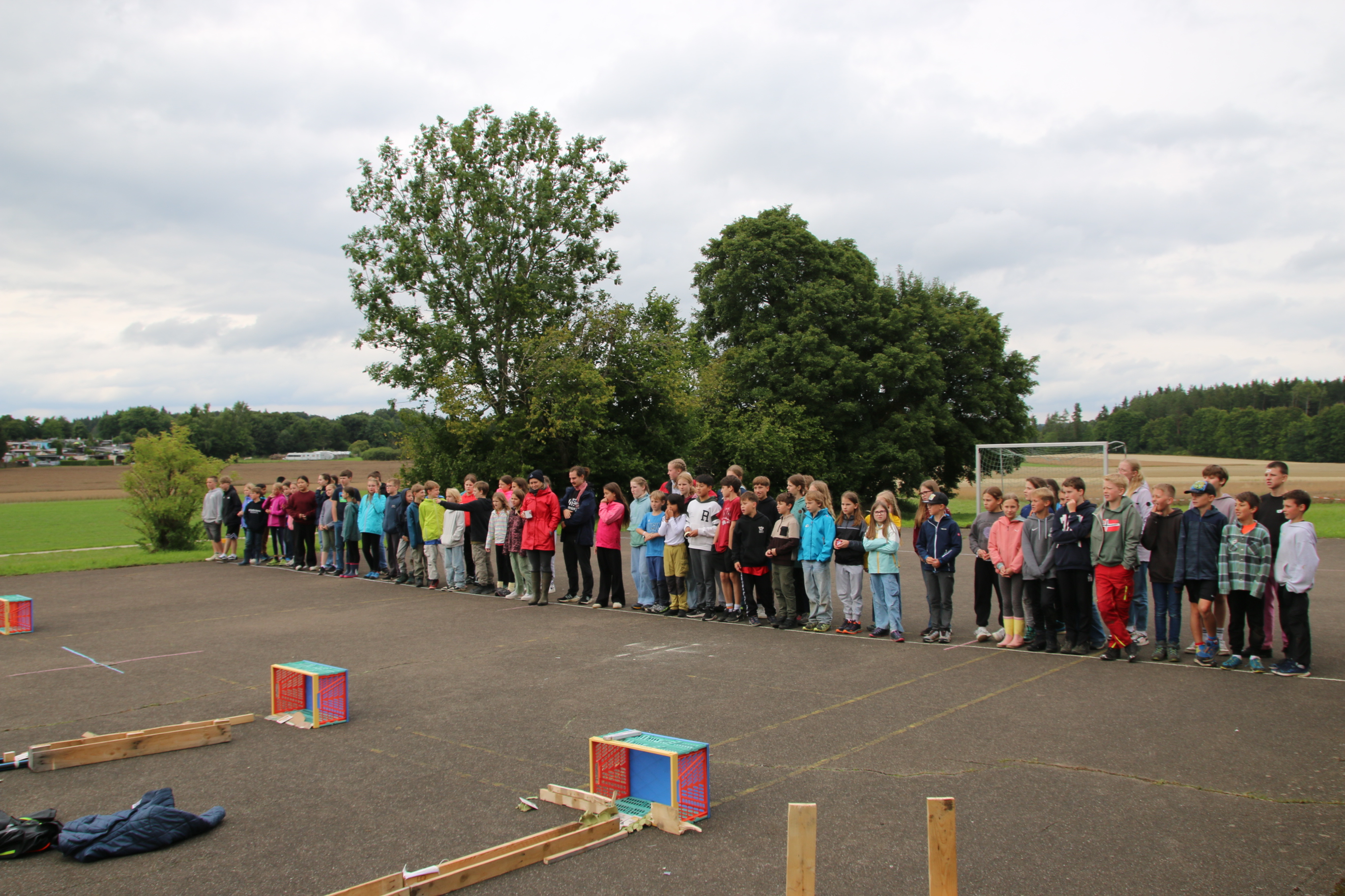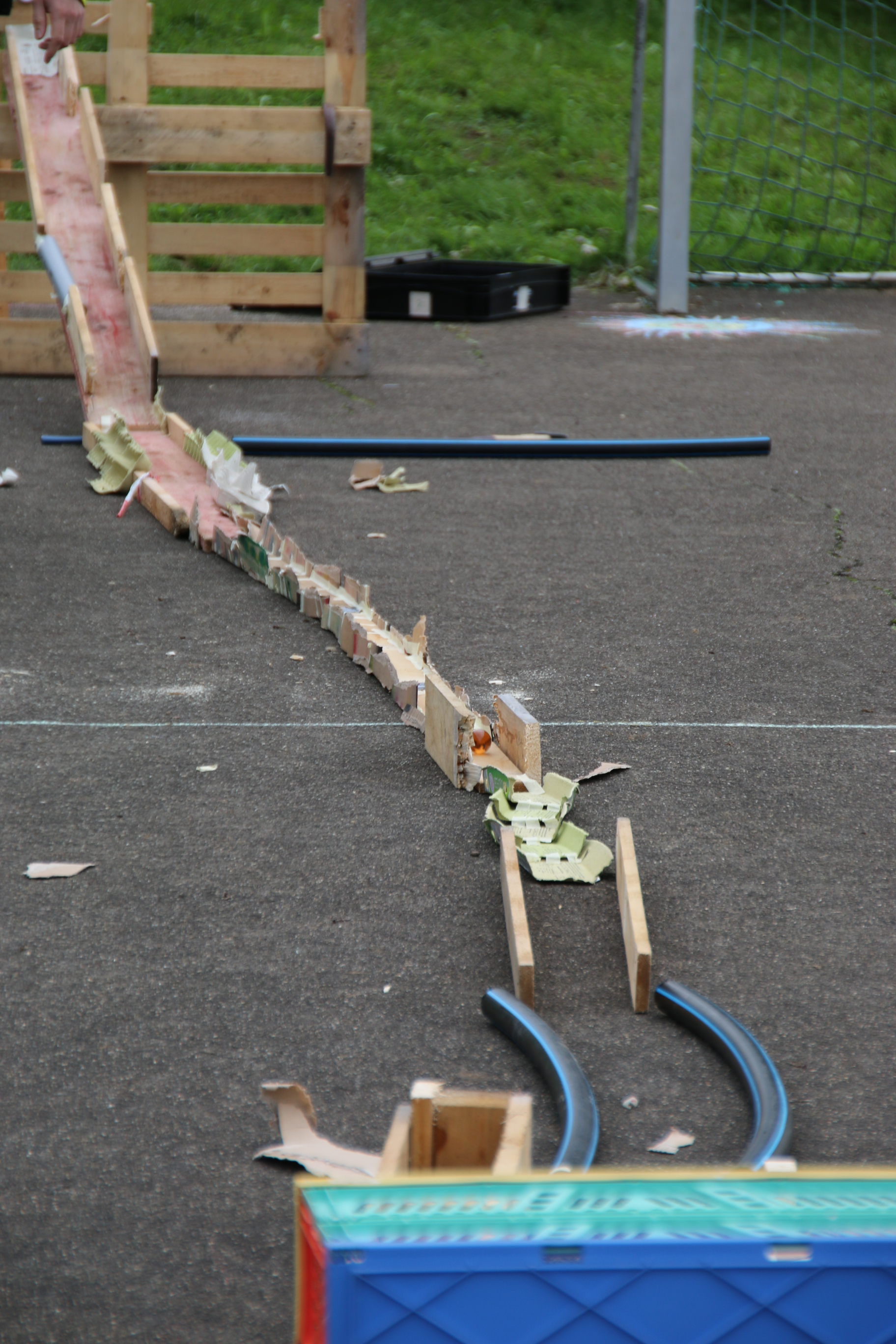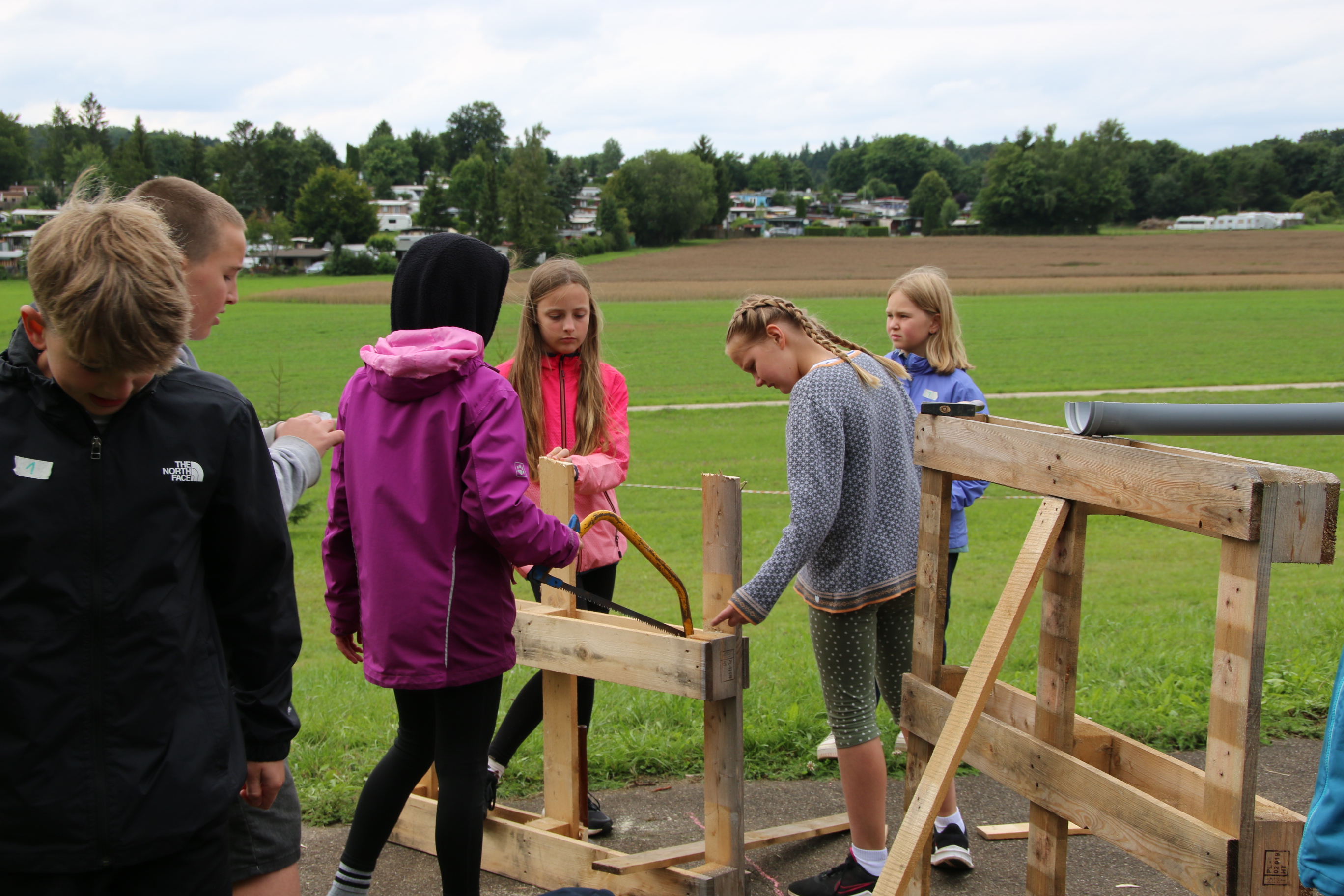Nach dem Mittagsschmaus und der Mittagsruhe ging es weiter mit „Cool Bauing“, einem Zeltlagerklassiker. Hier konnten die Kinder durch Mini-Spiele Münzen sammeln, um damit Baumaterialien zu sammeln. Mit den Baumaterialien wurde dieses Jahr eine Murmelbahn gebaut. Als die Bauwerke finalisiert waren, wurde geschaut, welche Bahn die Kugel am Weitesten trägt.