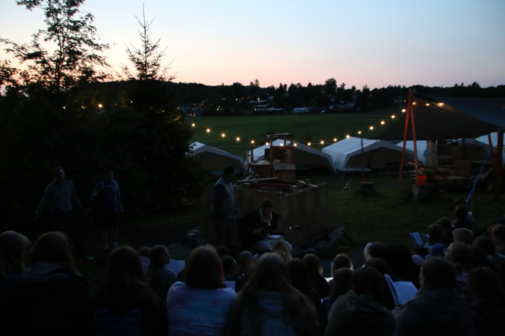 Vor dem erleuchtenden Tagesabschluss stimmten der Sonnenuntergang und der spontan gegründete Shanty-Chor „Die schwäbischen Goldkehlchen“ die Kinder mit Zeltlagerklassikern wie „Über den Wolken“ auf das bevorstehende Lagerfeuer ein.