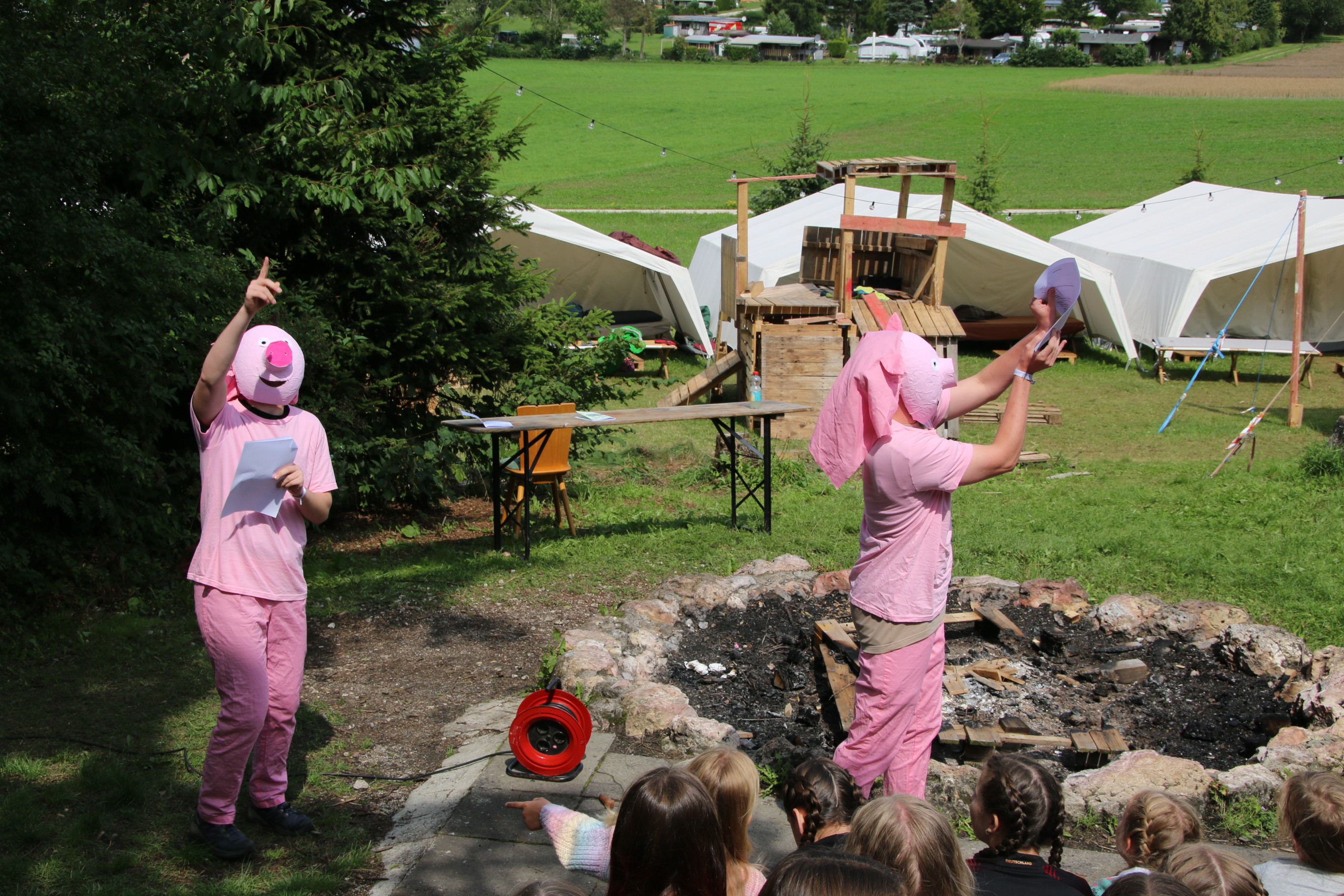 Und täglich grüßen die Schweinenasen – auch heute startete das Programm mit einem kurzen Schauspiel unserer diesjährigen Zeltlagermaskottchen Piggeldy und Frederick.