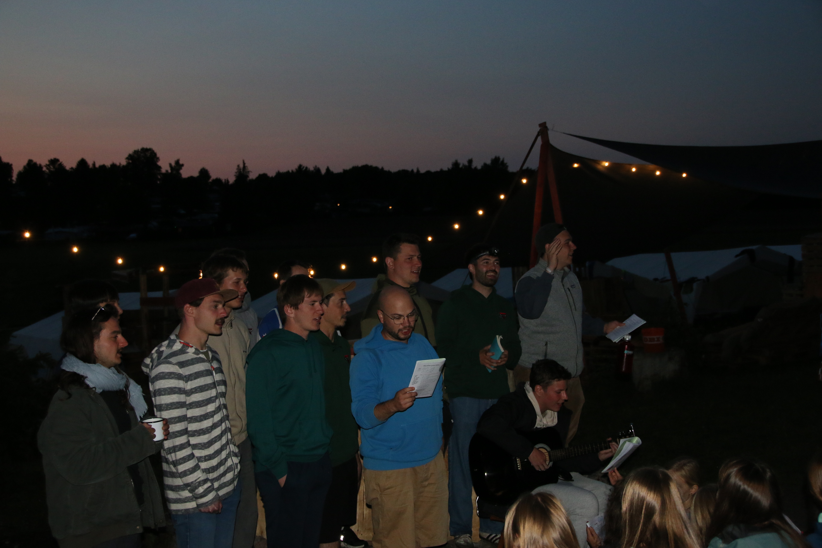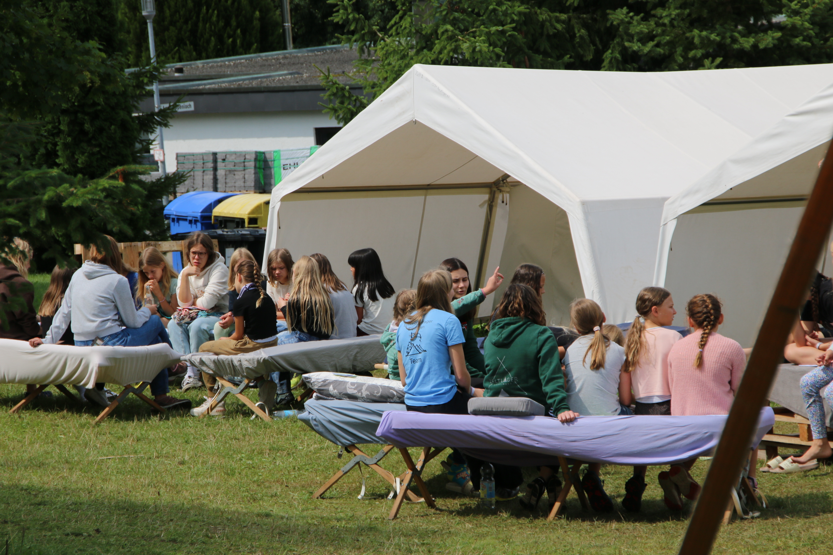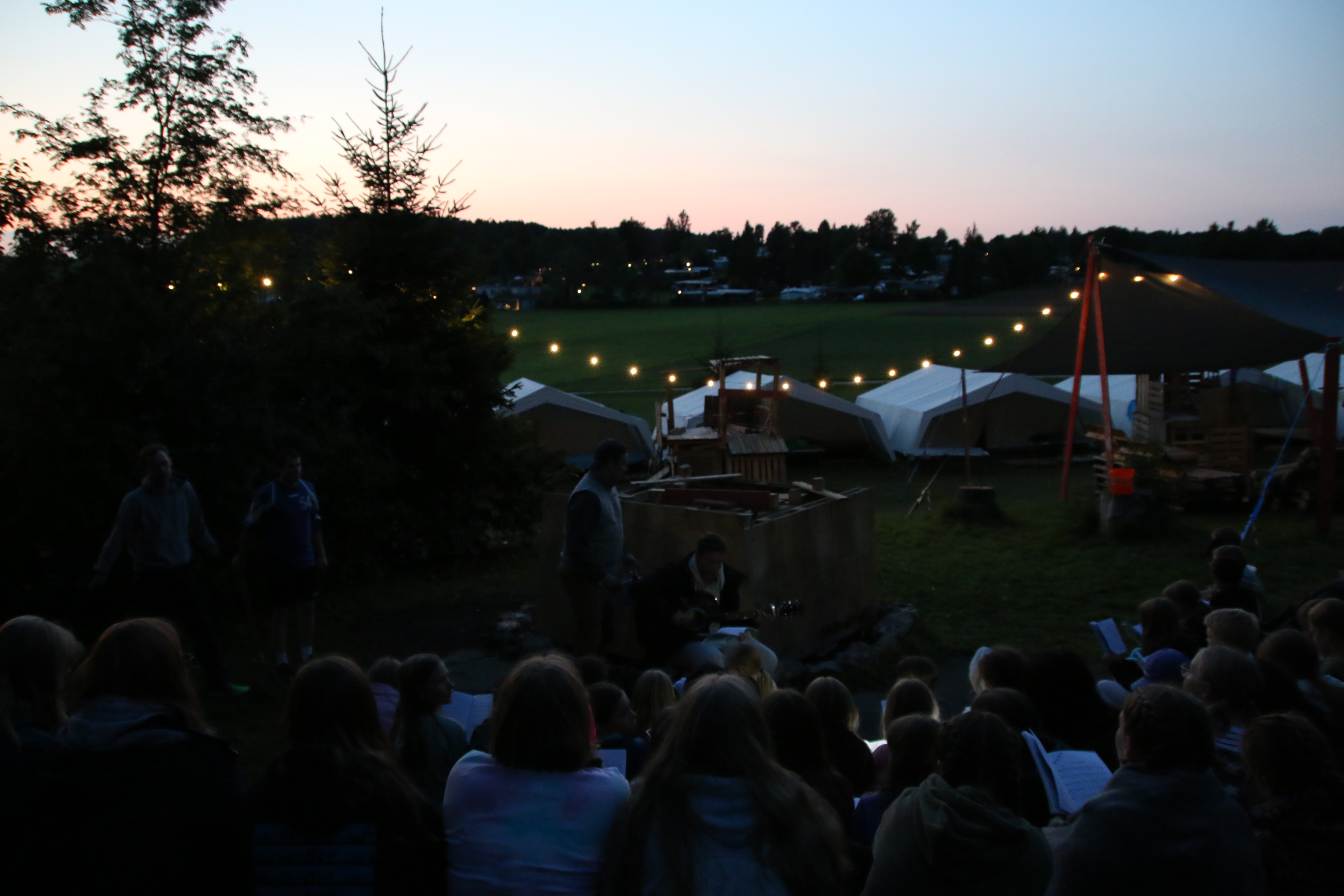 Vor dem erleuchtenden Tagesabschluss stimmten der Sonnenuntergang und der spontan gegründete Shanty-Chor „Die schwäbischen Goldkehlchen“ die Kinder mit Zeltlagerklassikern wie „Über den Wolken“ auf das bevorstehende Lagerfeuer ein.
