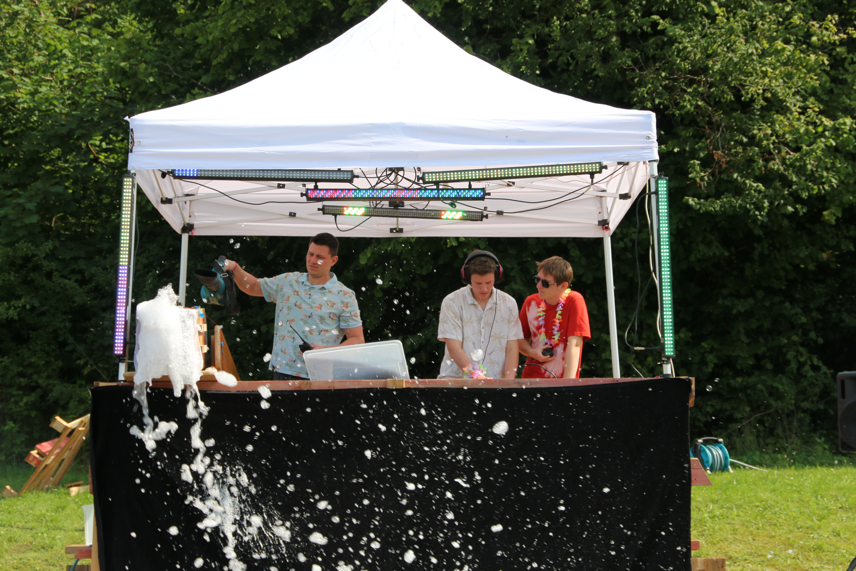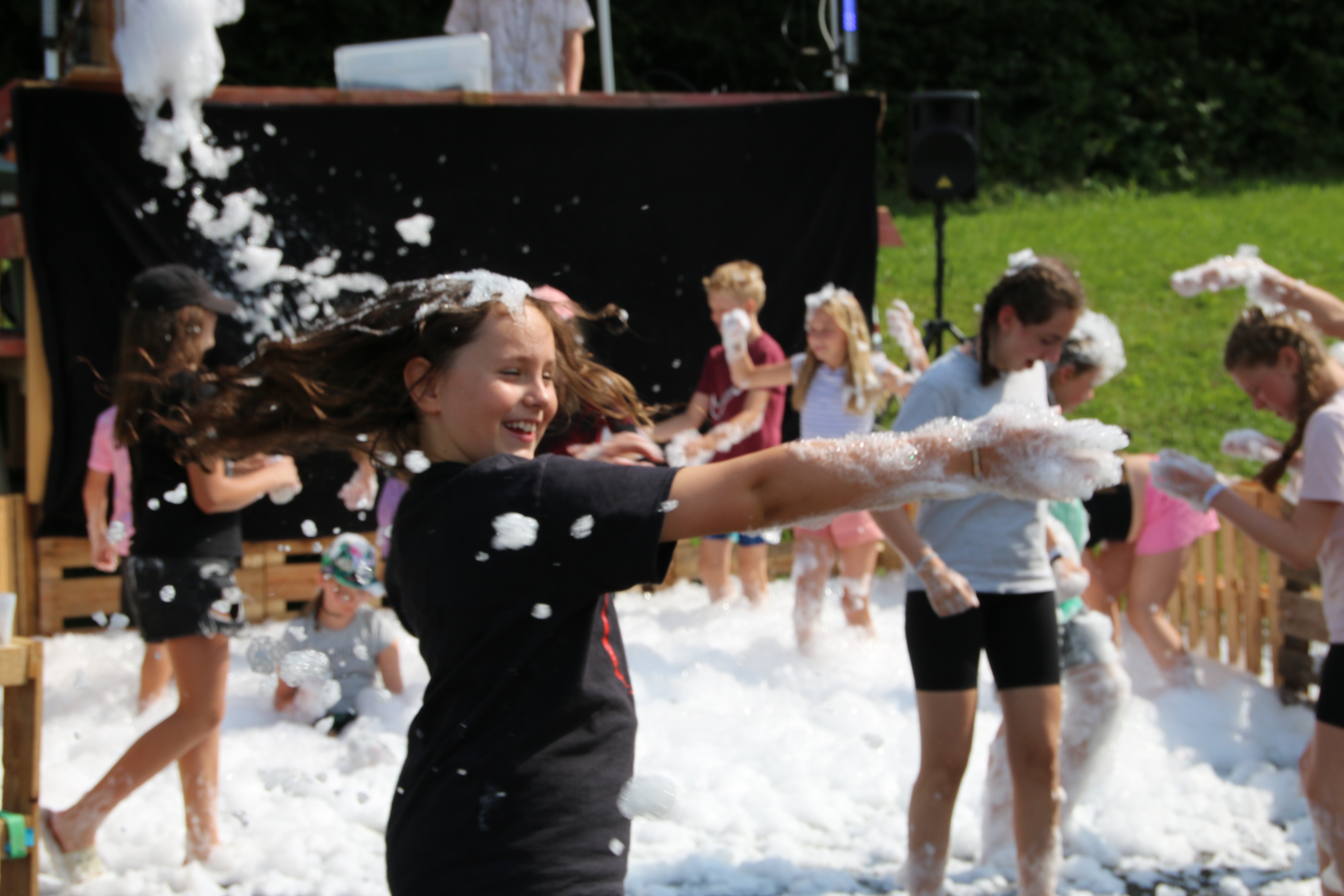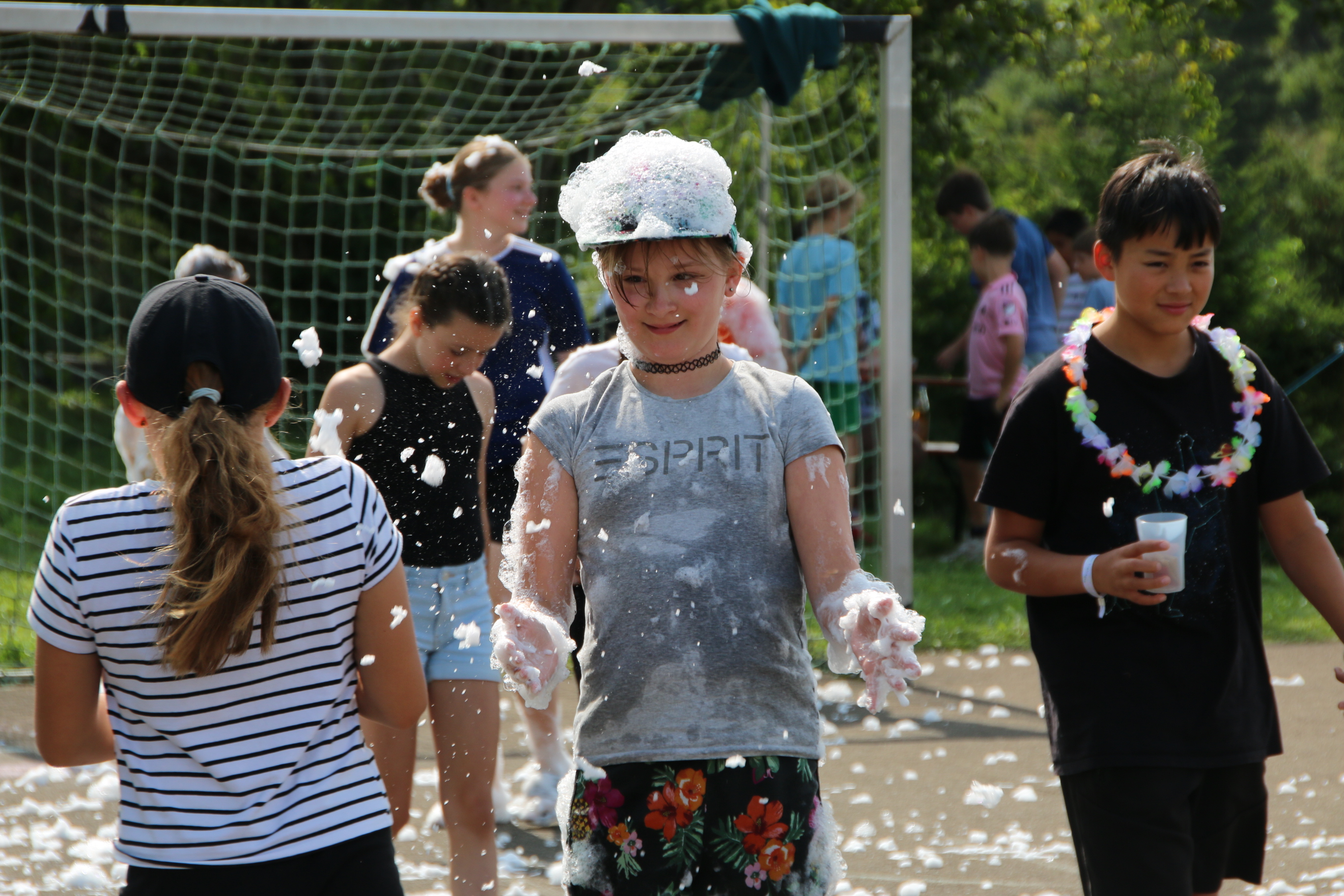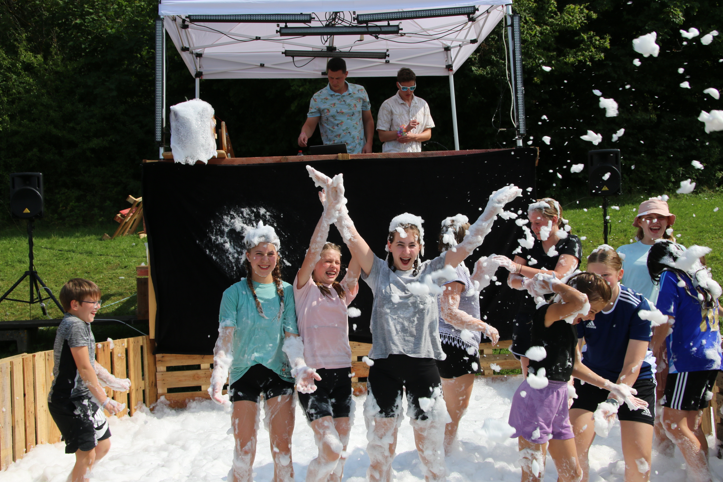 Neben der Möglichkeit, im Schaum zu tollen, konnten sich die Kinder an verschiedenen Spielstationen Marken für Getränke erspielen – so blieb niemand durstig, und das Tanzbein konnte ordentlich geschwungen werden!